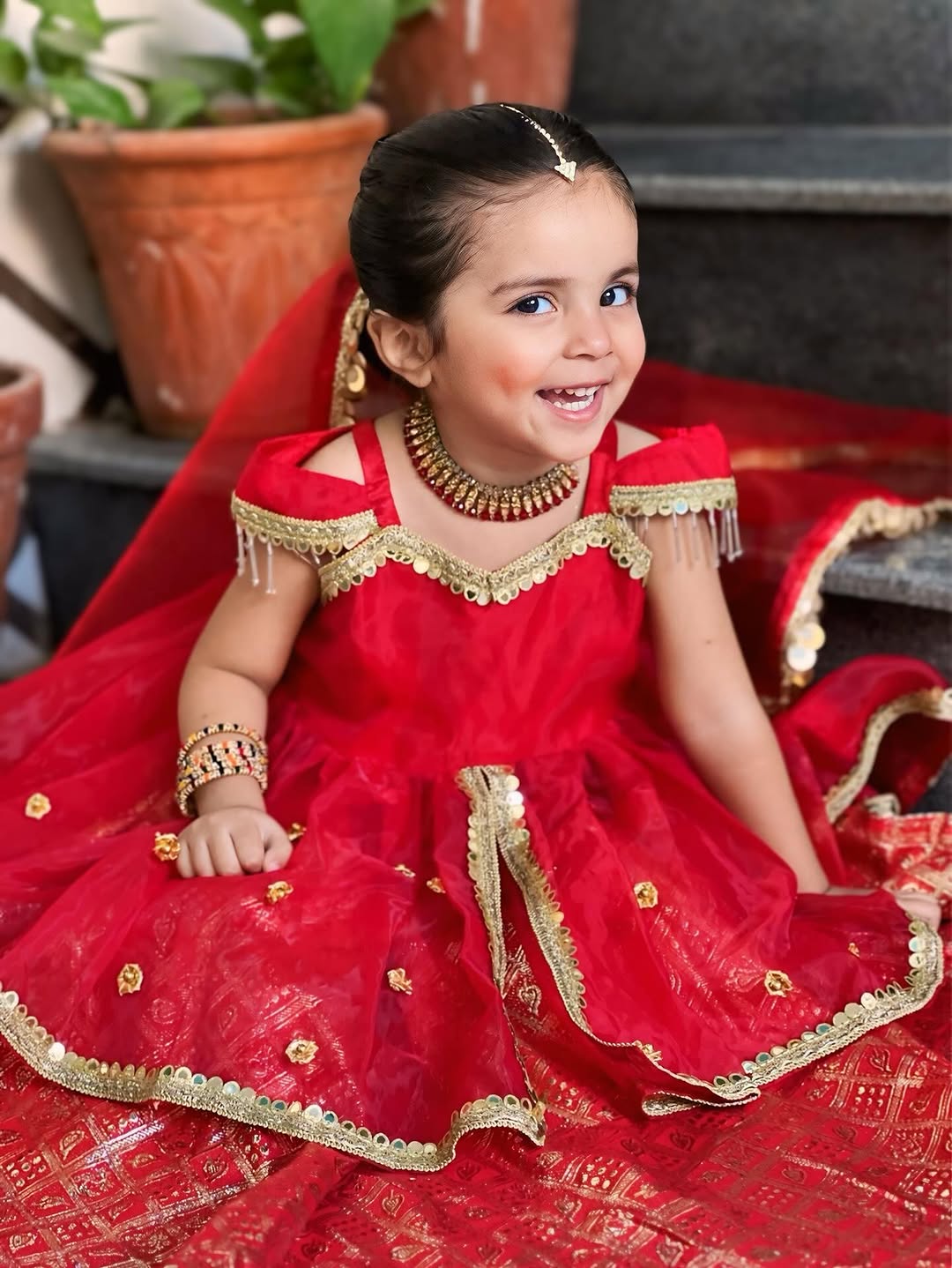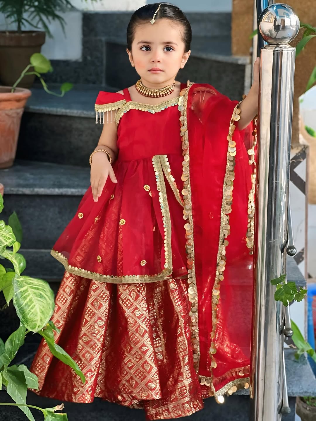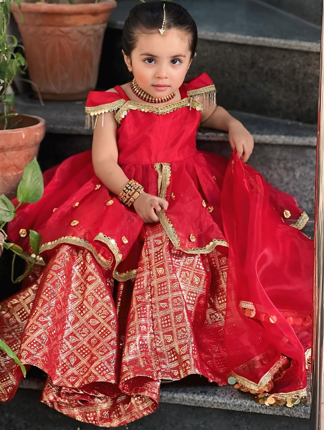 3. *Dupatta:* A sheer red dupatta (shawl) edged with gold sequin (coin) lace on all sides and adorned with small gold mirror work, draped over one shoulder.