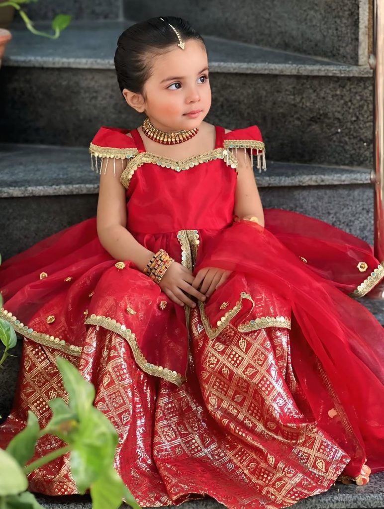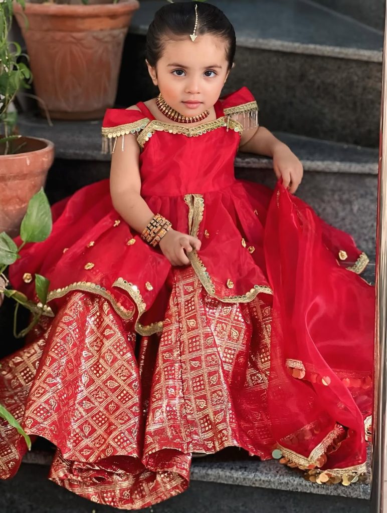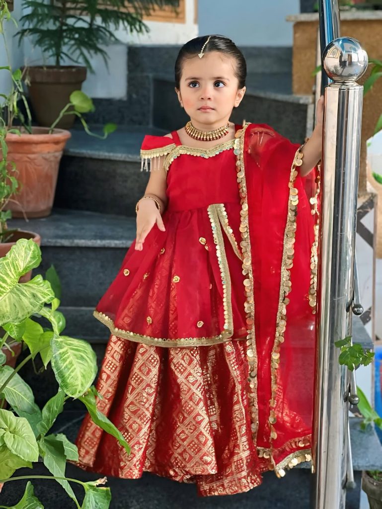 2. *Skirt (lehenga):* A red flared skirt with an intricate gold patterned band at the bottom, giving it an elegant, embroidered finish. Small gold mirror embellishments are scattered on the skirt fabric.