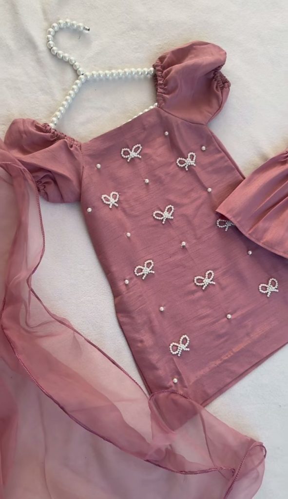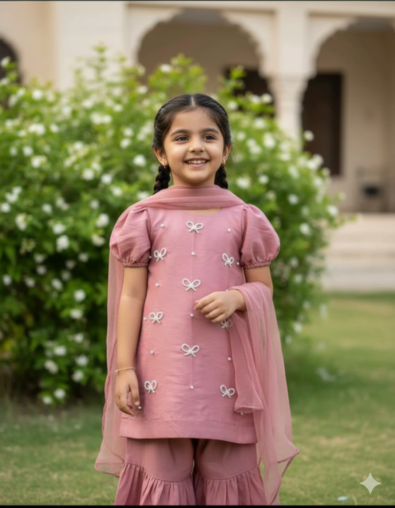Fabric: raw silk, with white beads work and bow customization all over the shirt. Fluffy sleeves, 3-step sharara trouser.