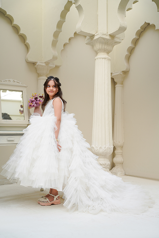 Knee-length frock with step-wise design and long tail. Made with kasab net fabric and silk, featuring an attached can-can.