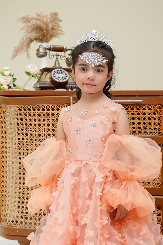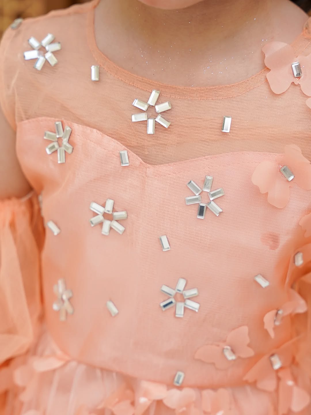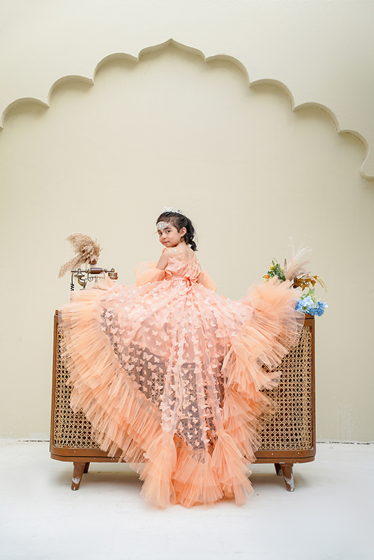 Floor length frock with step-wise design beads on body and long tail. Made with butterfly net fabric and silk, featuring an attached can-can.
