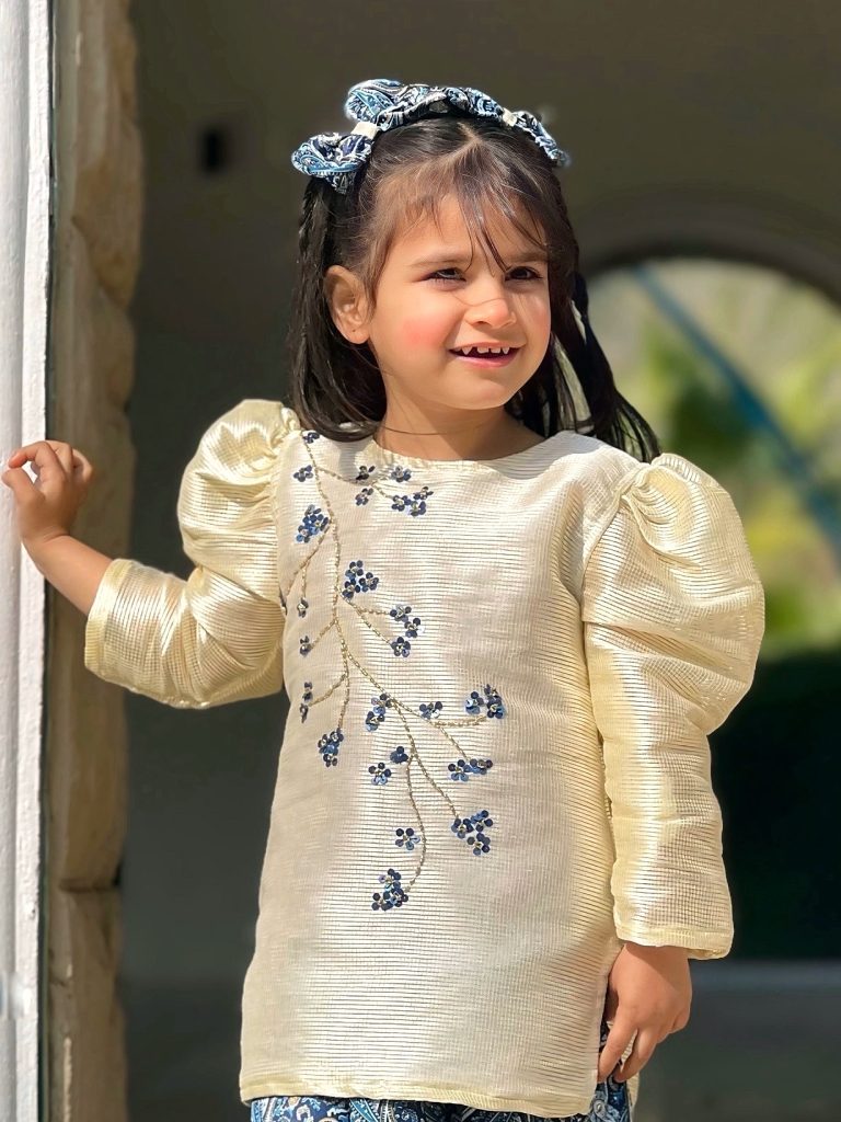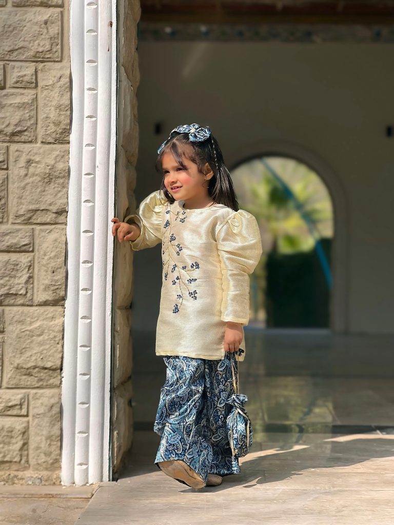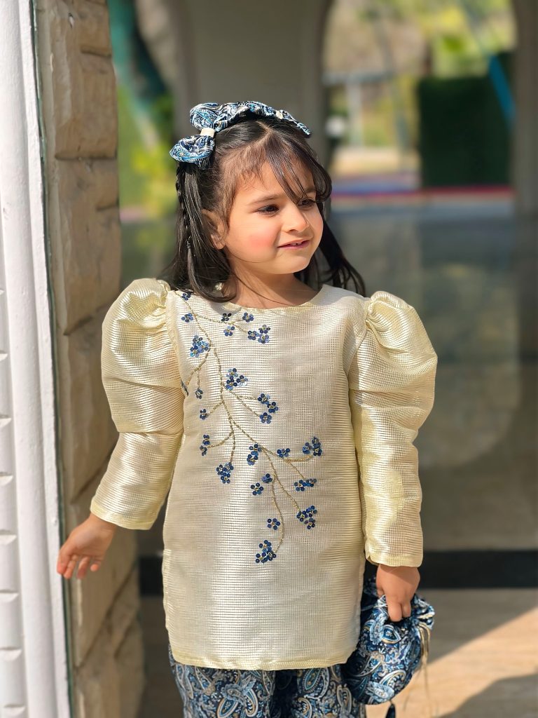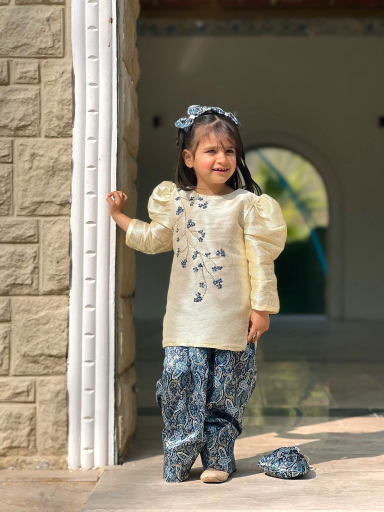 - The dress is a charming cream-colored, puff-sleeve top paired with blue paisley shalwar. The top features textured fabric with delicate blue floral embroidery running diagonally across the front, giving it an elegant, traditional look. The matching blue paisley shalwar has a comfortable, flowy fit, and the outfit is accessorized with a blue patterned scrunchie hairband and matching fabric shoes. It’s a stylish, festive ensemble perfect for young girls.