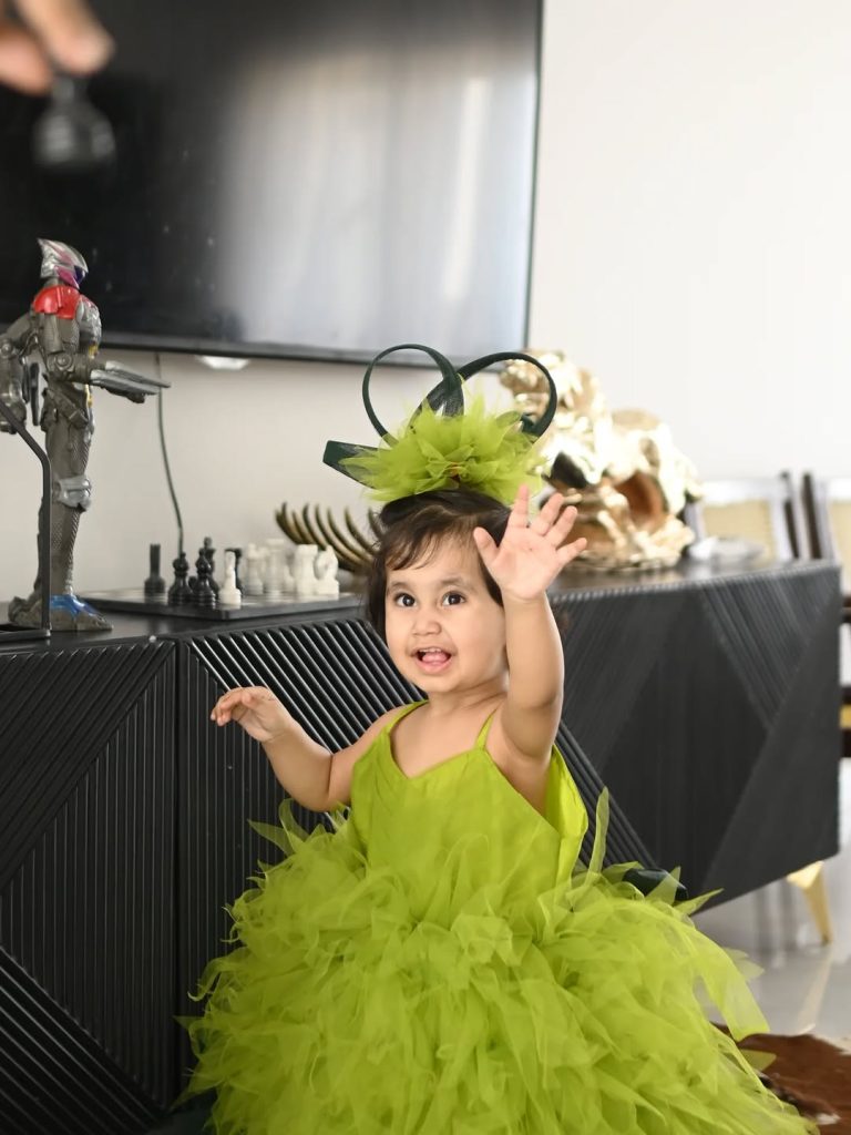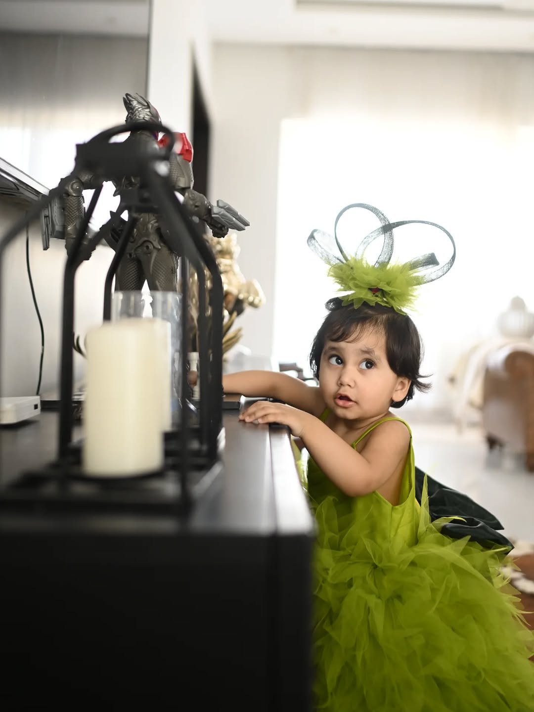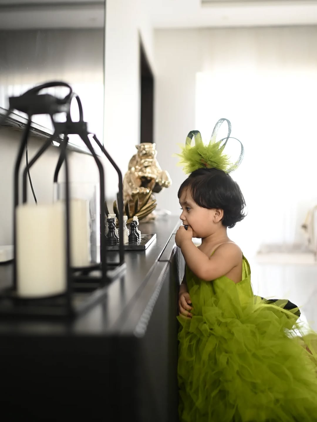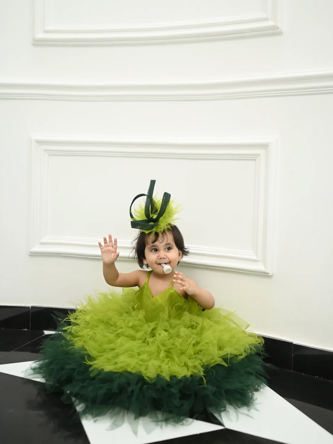 It is accessorized with a matching green ribbon fascinator topped with a fluffy tulle bow, adding a playful, elegant touch perfect for special occasions.