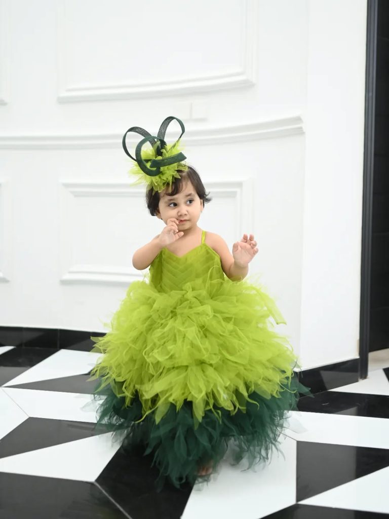 The dress is a vibrant lime‑green party gown with thin spaghetti straps and a V‑neck bodice. The skirt is a layered, fluffy tulle design that graduates from bright lime green at the top to a darker forest‑green ombre at the hem, creating a dramatic, cloud‑like effect.