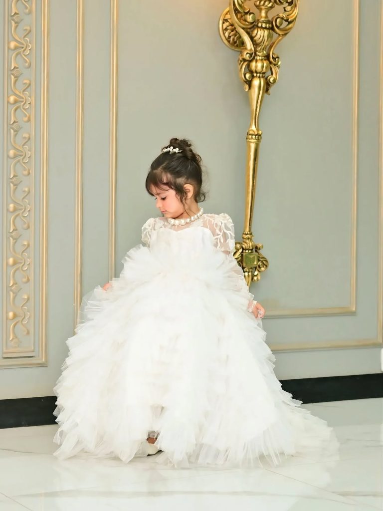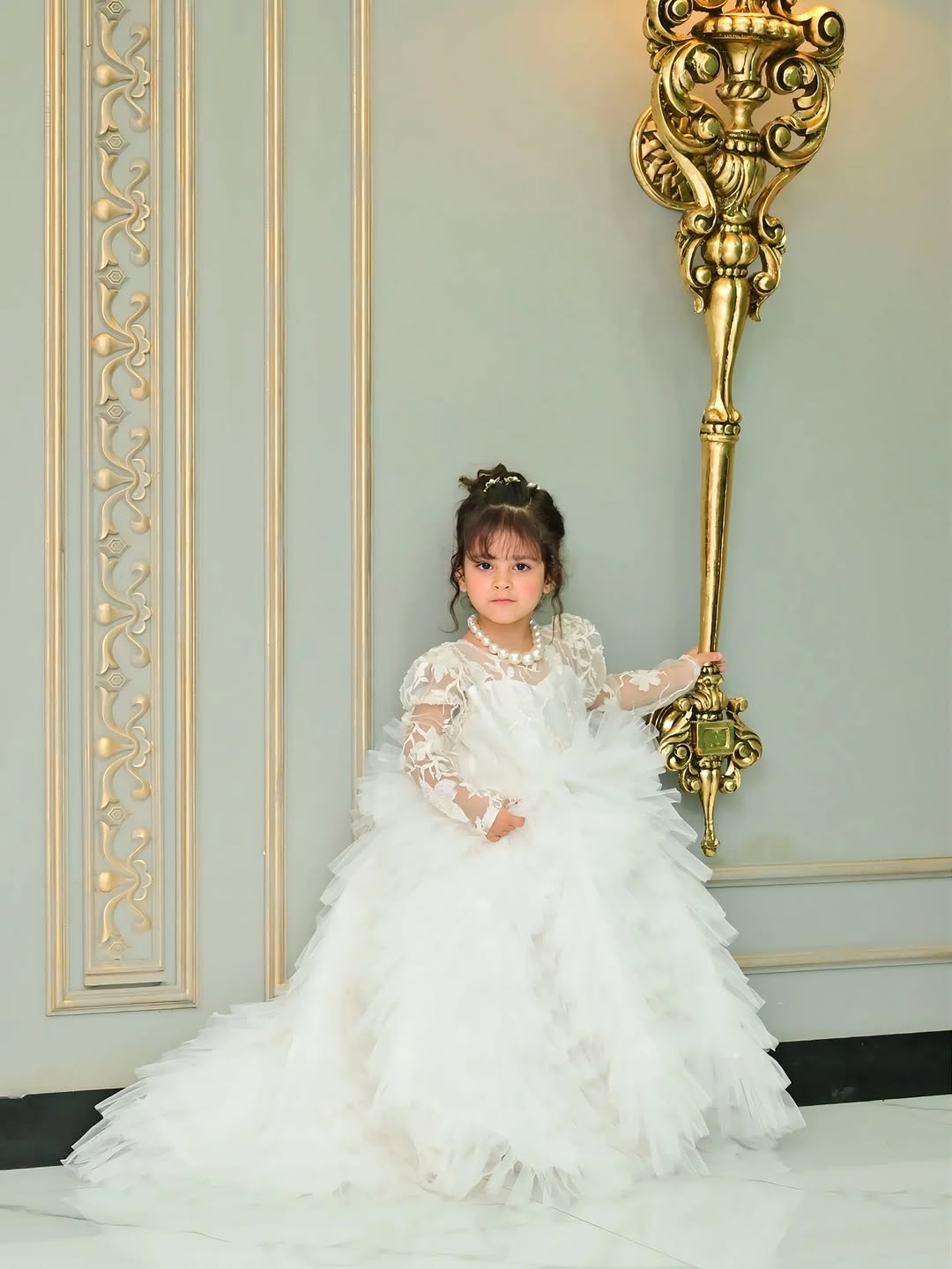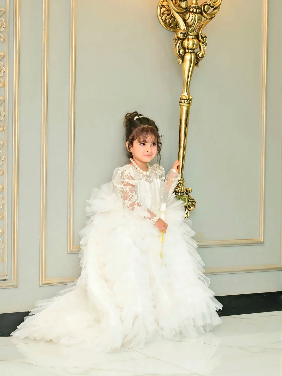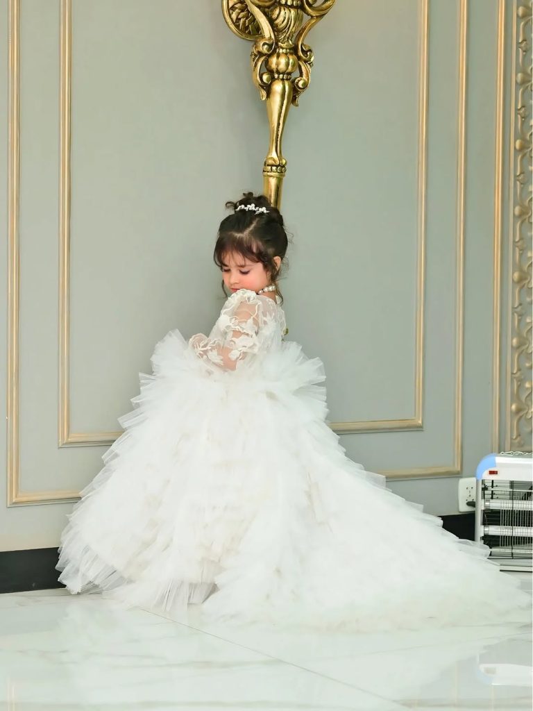 The dress is a luxurious white gown with lace sheer long sleeves and a full, layered tulle skirt that gives it a fluffy, princess‑like silhouette. The bodice features delicate lace detailing . The overall style is elegant and festive, perfect for special occasions like weddings or birthday parties.