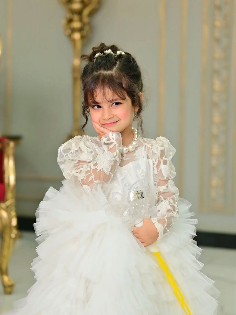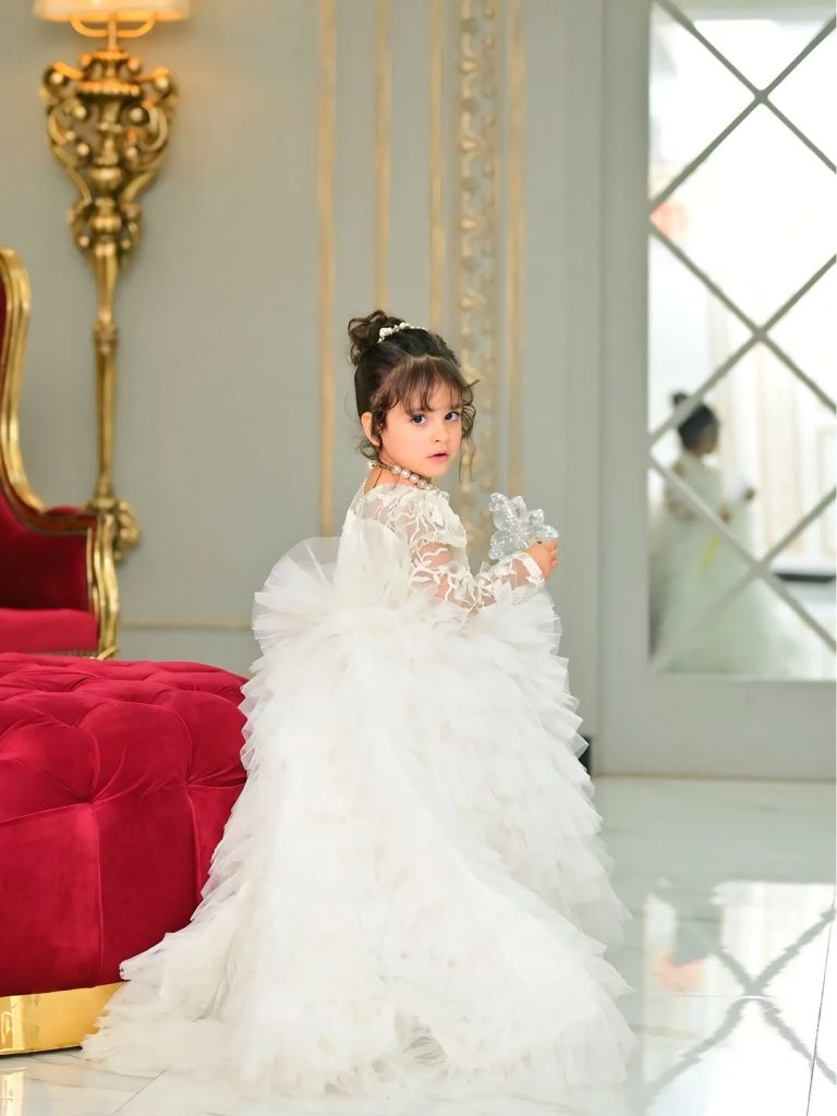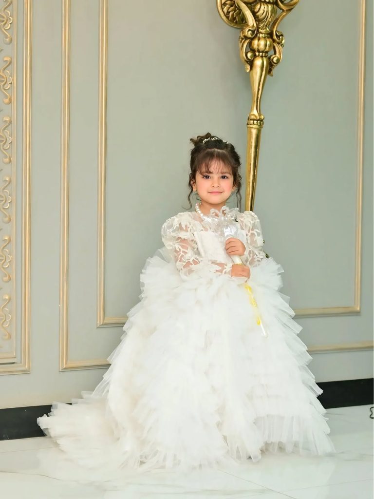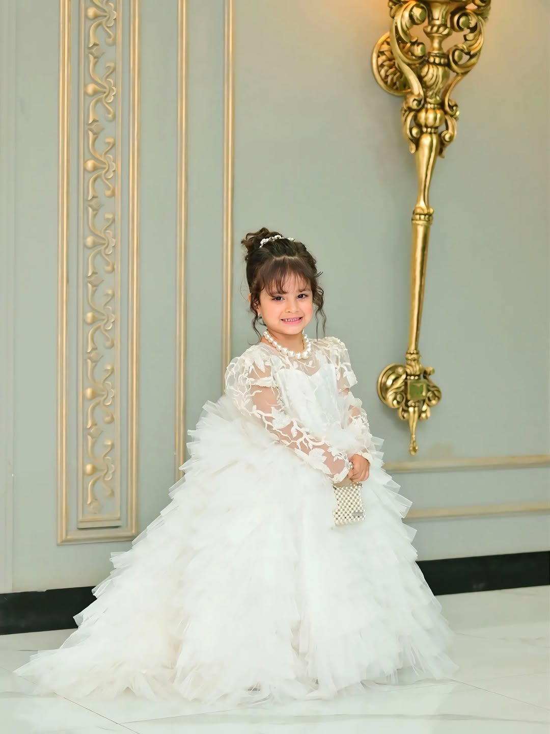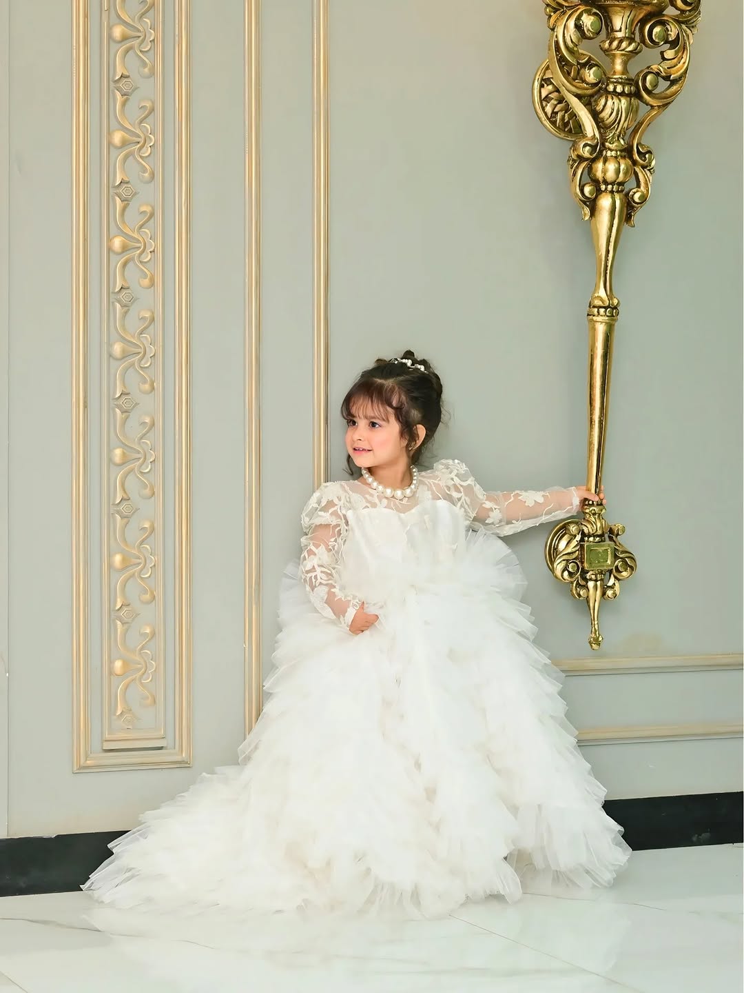 The dress is a luxurious white gown with lace sheer long sleeves and a full, layered tulle skirt that gives it a fluffy, princess‑like silhouette. The bodice features delicate lace detailing . The overall style is elegant and festive, perfect for special occasions like weddings or birthday parties.