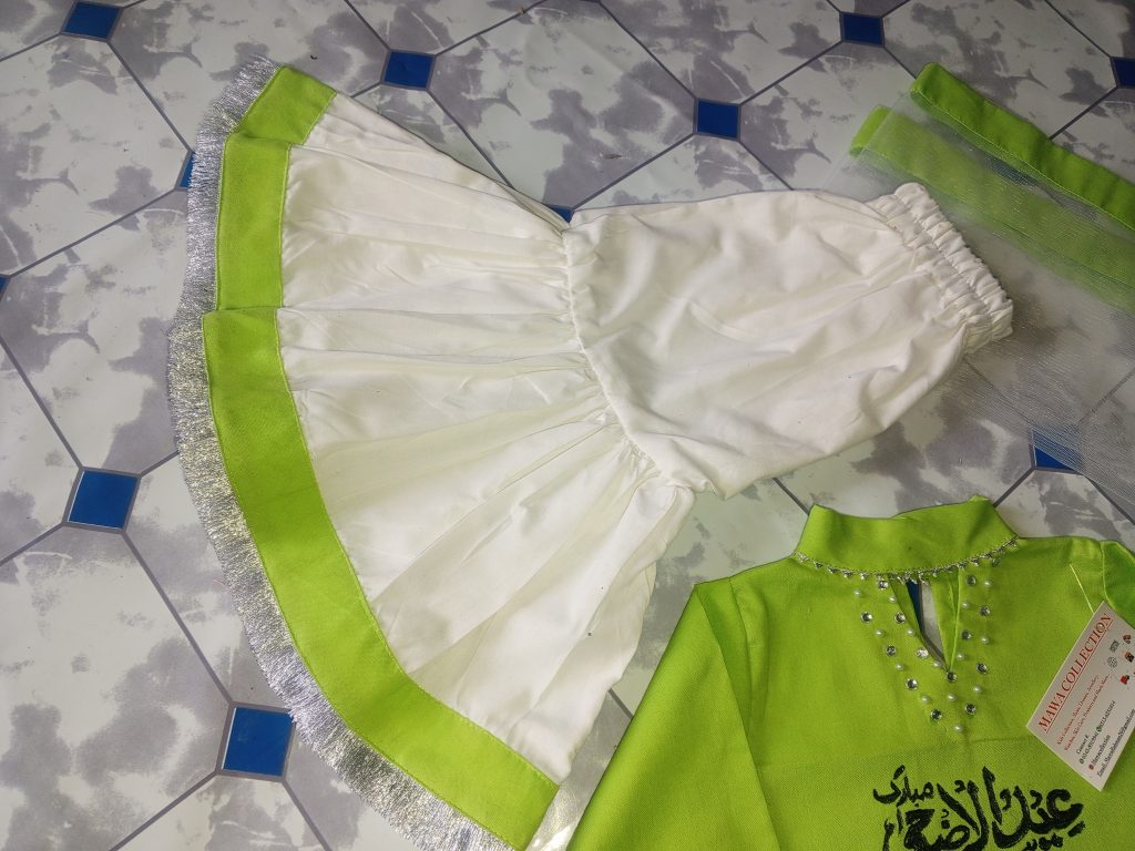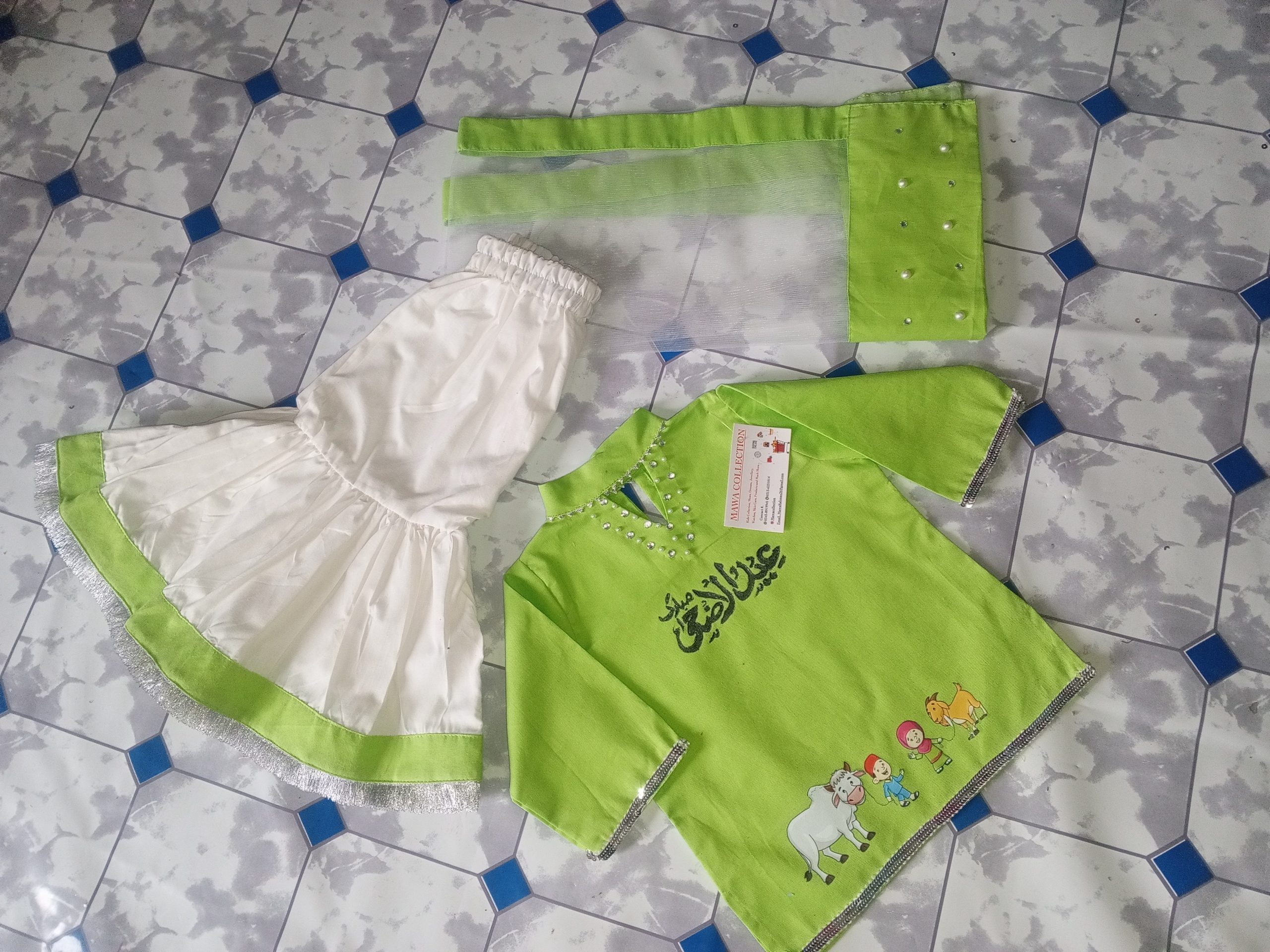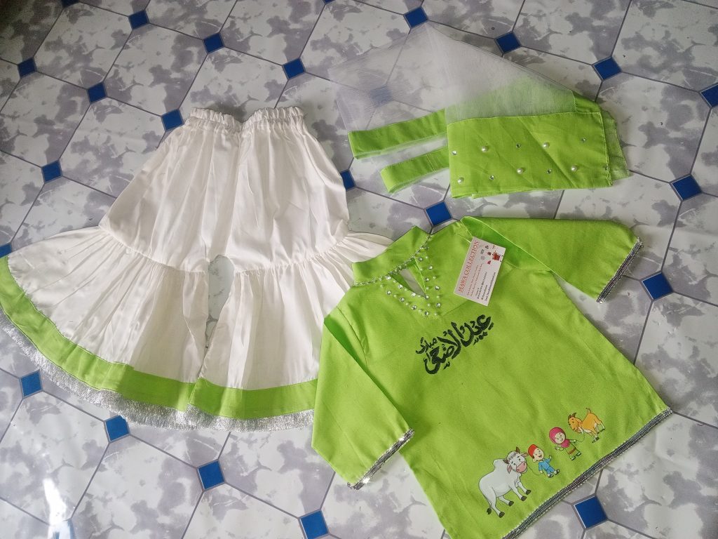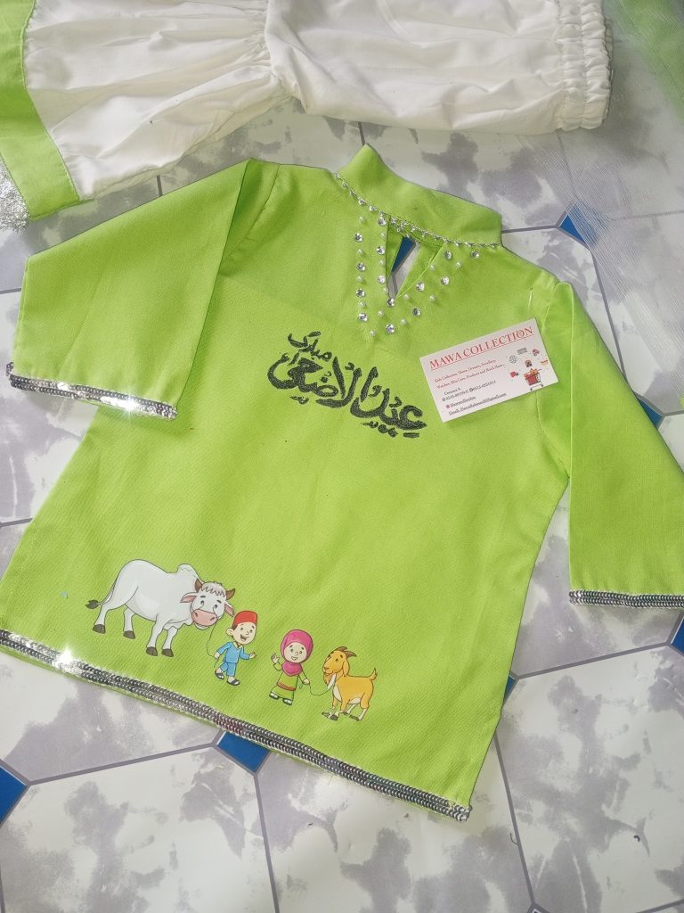 1. *Green kurta (shirt)* – a bright parrot‑green top with long sleeves, embellished with silver lace on the collar, cuffs, and hem. It features pearl‑like decorative stones around the neckline and Arabic calligraphy in black that reads “عید مبارک” (Eid Mubarak). The bottom hem showcases a colorful appliqué of a cow, a child in blue, a child in red hijab, and a goat.
