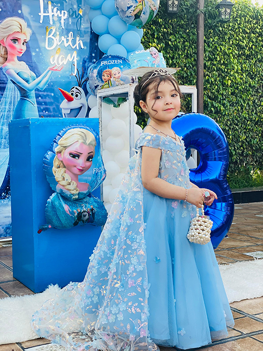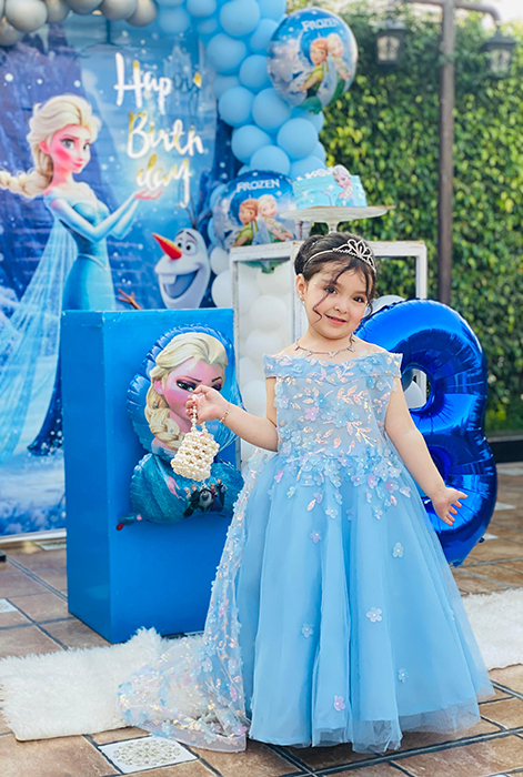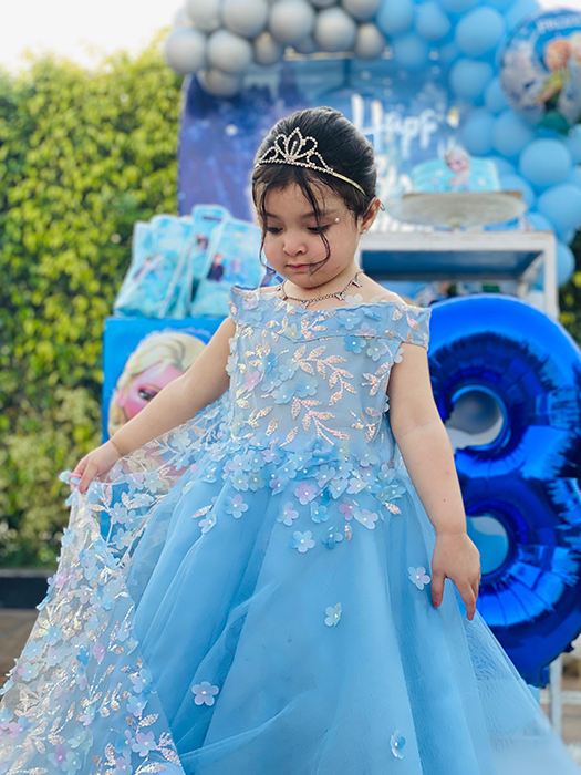 The article is off-the-shoulder gown with a layered tulle skirt and floral appliqué embellishments in pastel pink and white. It has a fitted bodice with sheer, lace-like detailing and a full, flowing skirt that gives it a princess‑style look, perfect for a themed birthday party like the Frozen décor shown in the background.