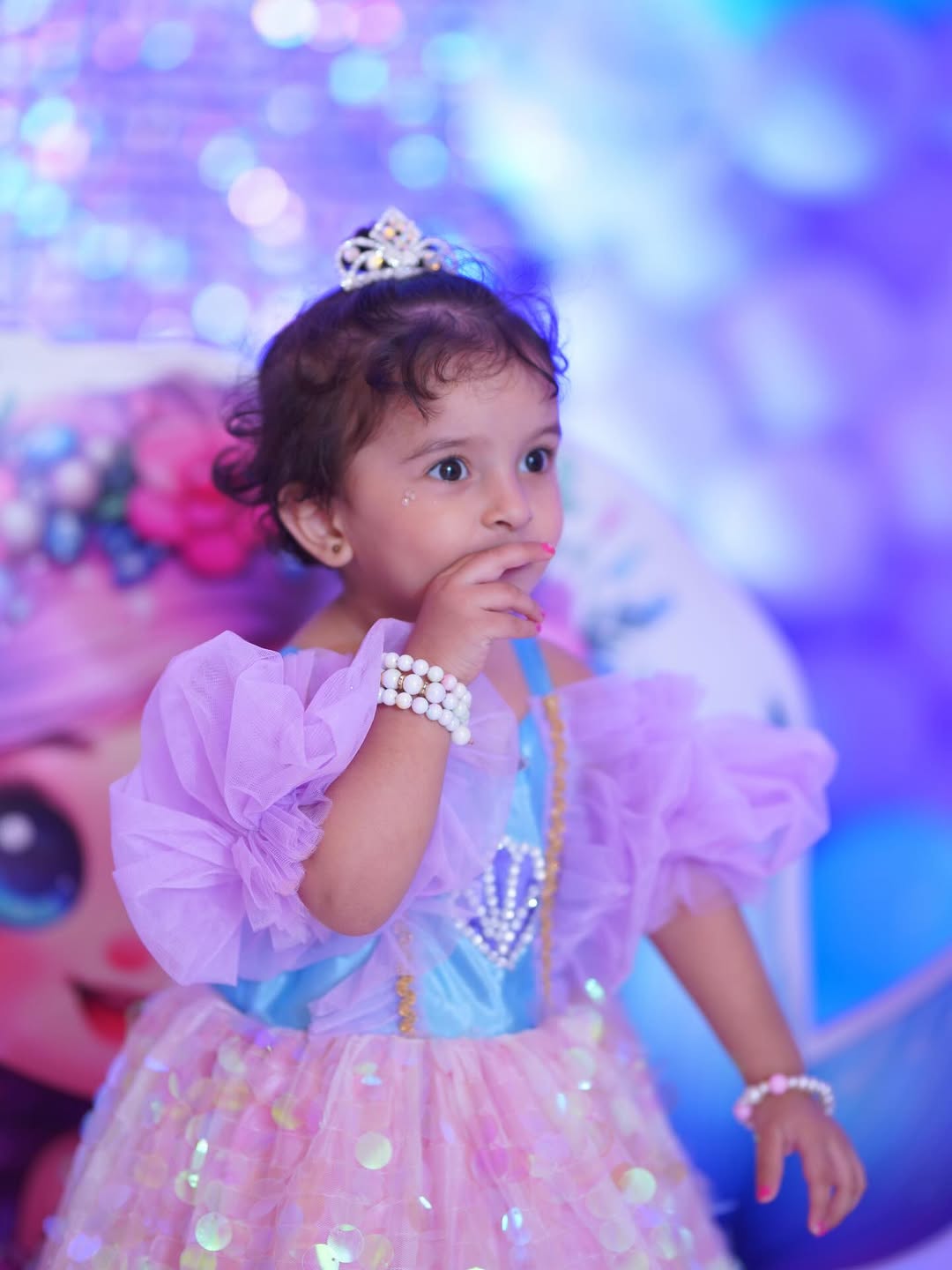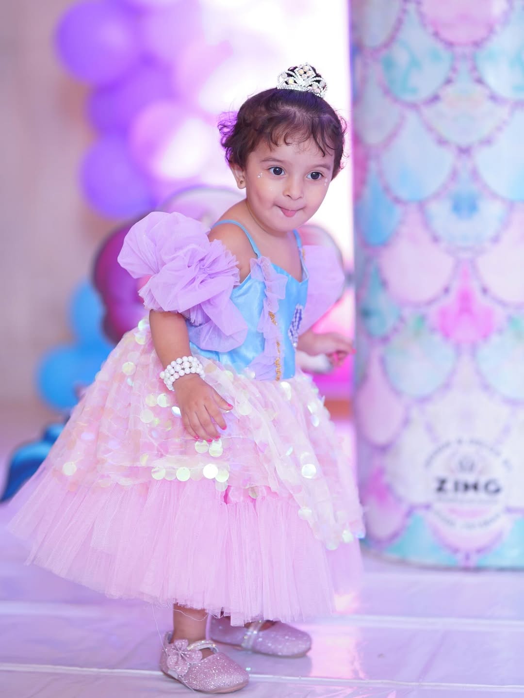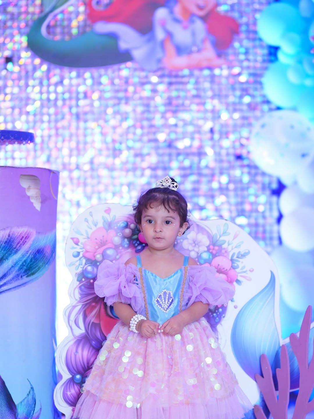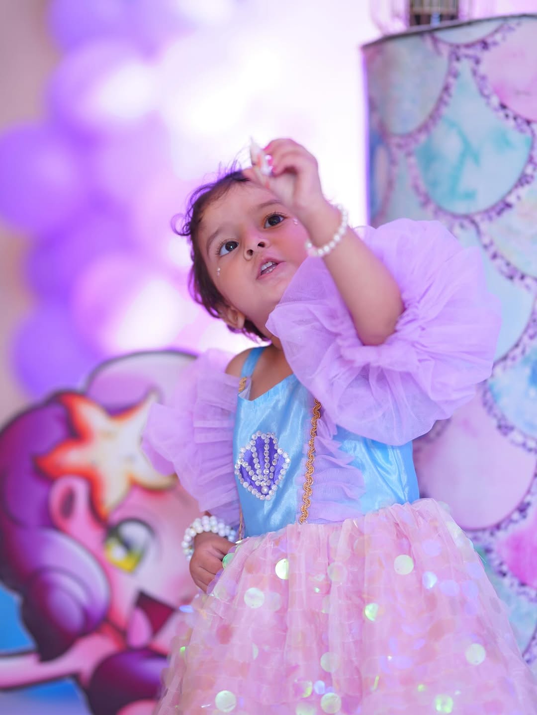 The dress is a charming, layered ensemble inspired by fantasy themes. It features a light blue bodice with an embellished seashell motif and delicate gold trim, paired with puffy lavender off‑the‑shoulder sleeves. The skirt combines a pink tulle layer with shimmering gold sequin circles over a soft pink base, giving it a sparkling, ethereal look.