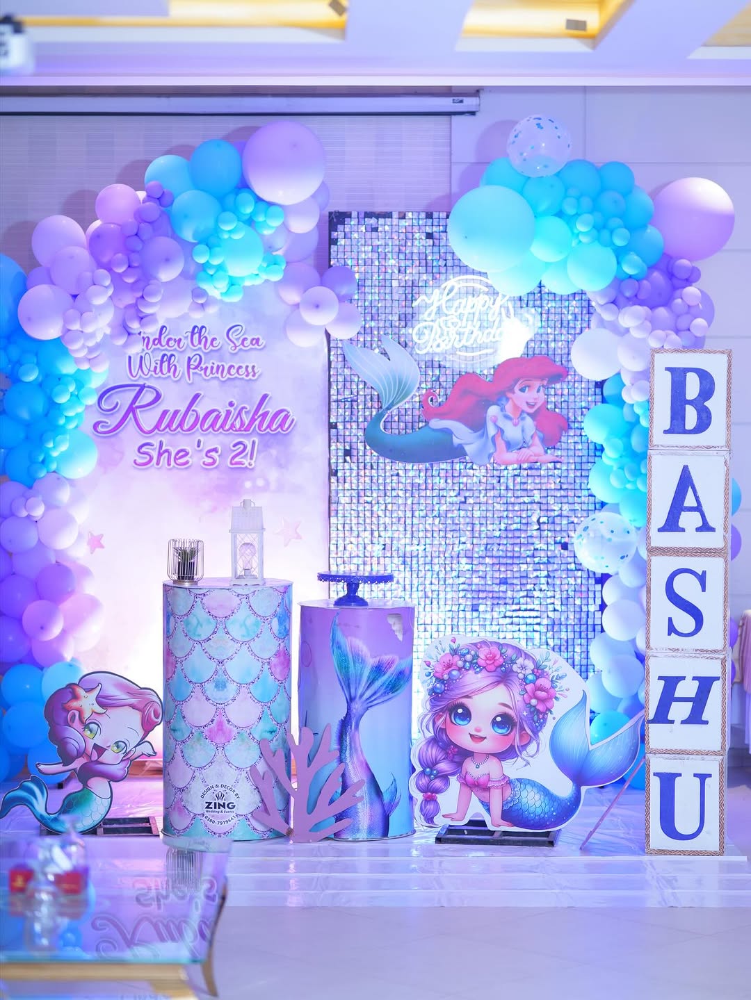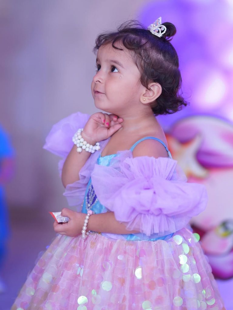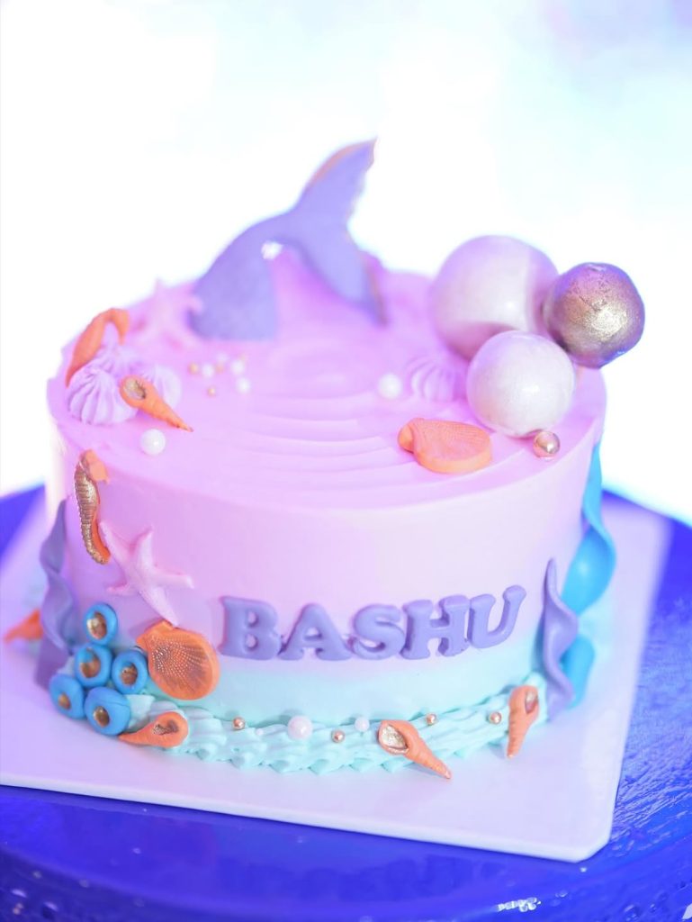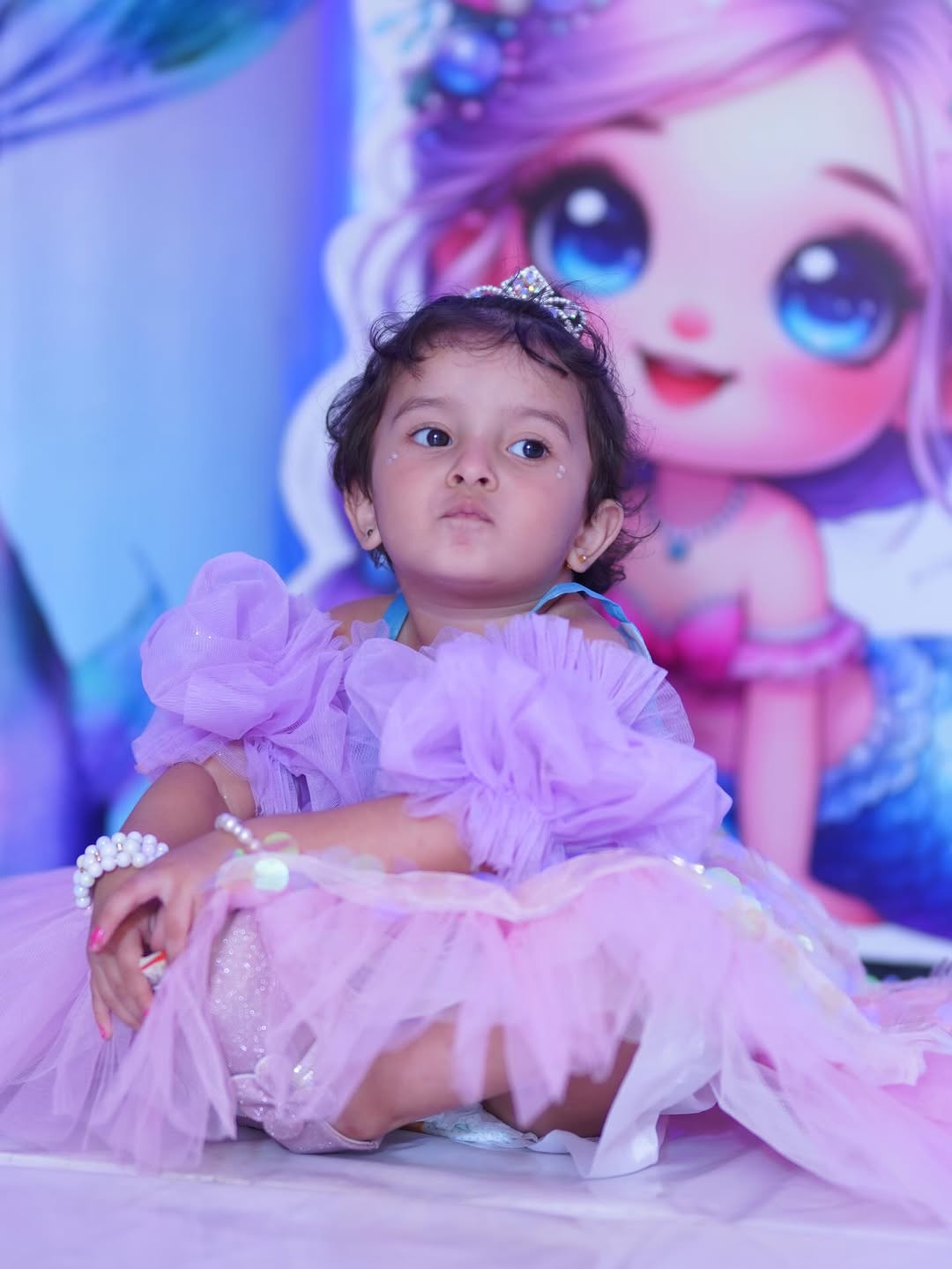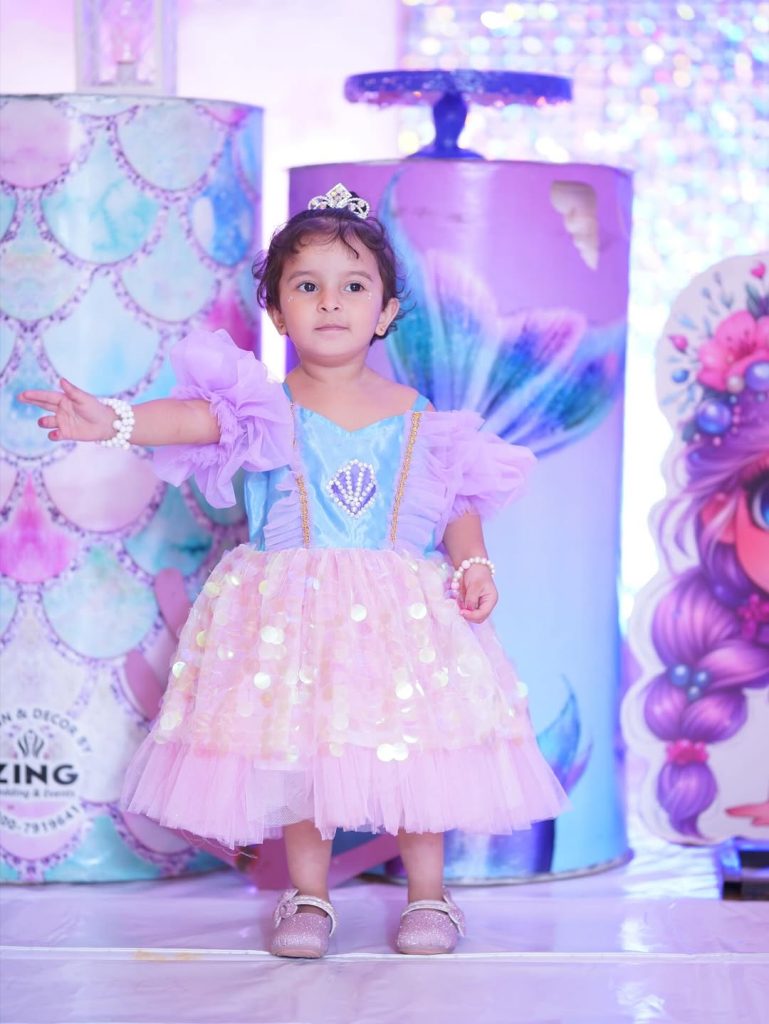 The dress is a charming, layered ensemble inspired by fantasy themes. It features a light blue bodice with an embellished seashell motif and delicate gold trim, paired with puffy lavender off‑the‑shoulder sleeves. The skirt combines a pink tulle layer with shimmering gold sequin circles over a soft pink base, giving it a sparkling, ethereal look.
