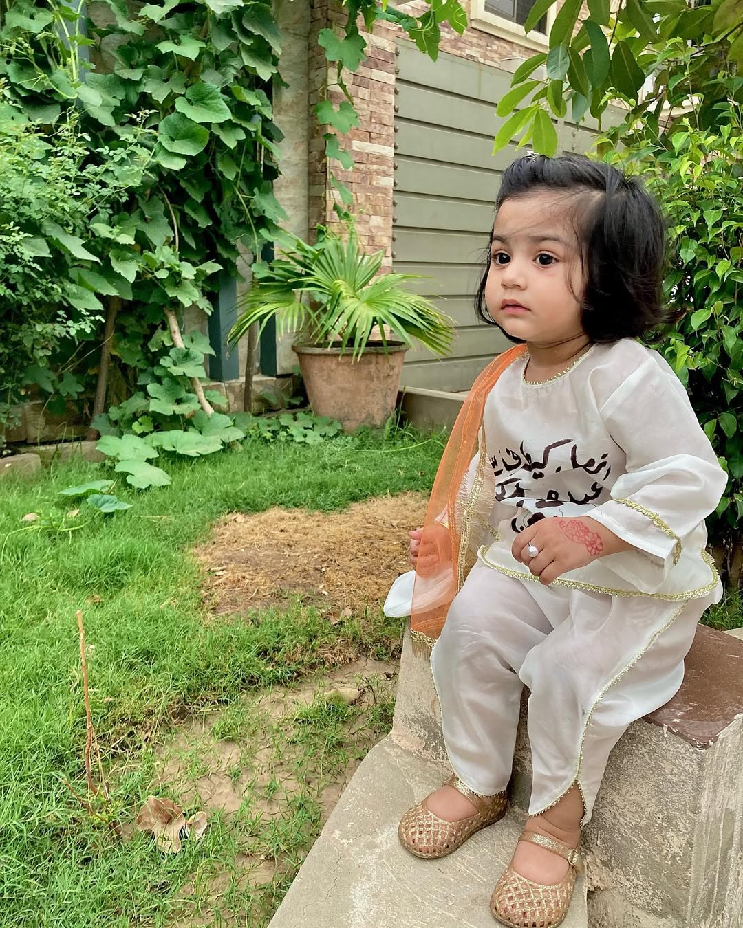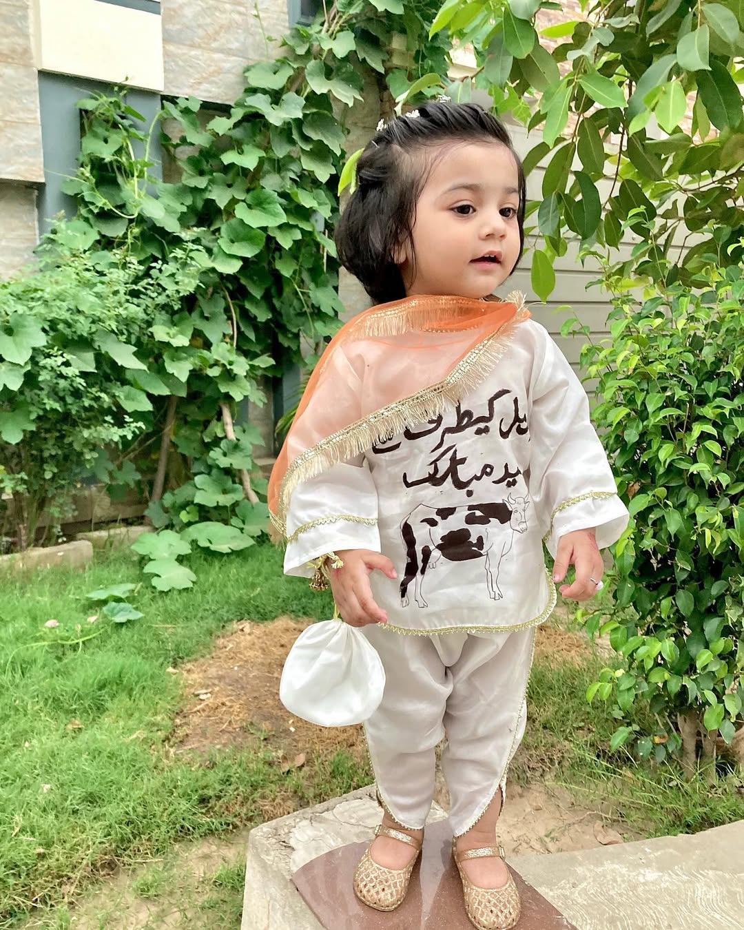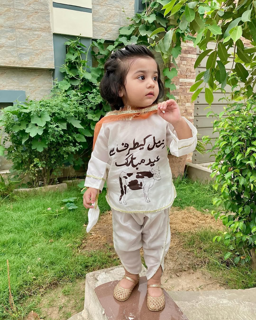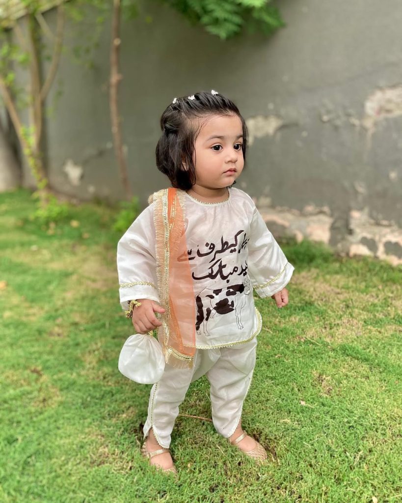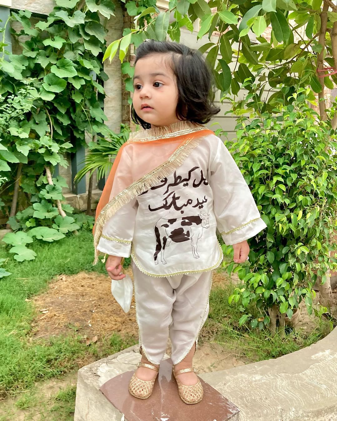 The dress is a white traditional outfit with gold-trimmed details, consisting of a long-sleeve shirt paired with matching pants. The shirt features an orange sheer dupatta attached at the shoulders with gold fringe, and it has gold lace edging on the sleeves and hem. The front design includes black Urdu script above a printed brown cow illustration. Fabric cotton/silk.