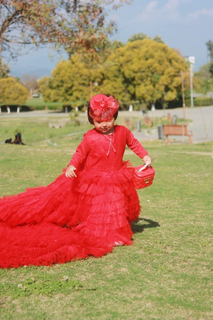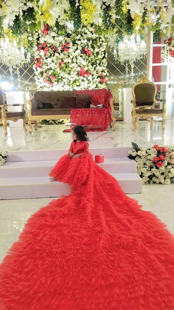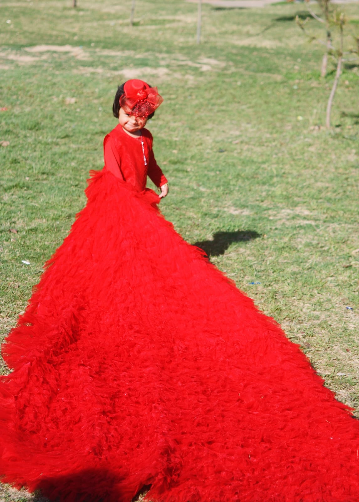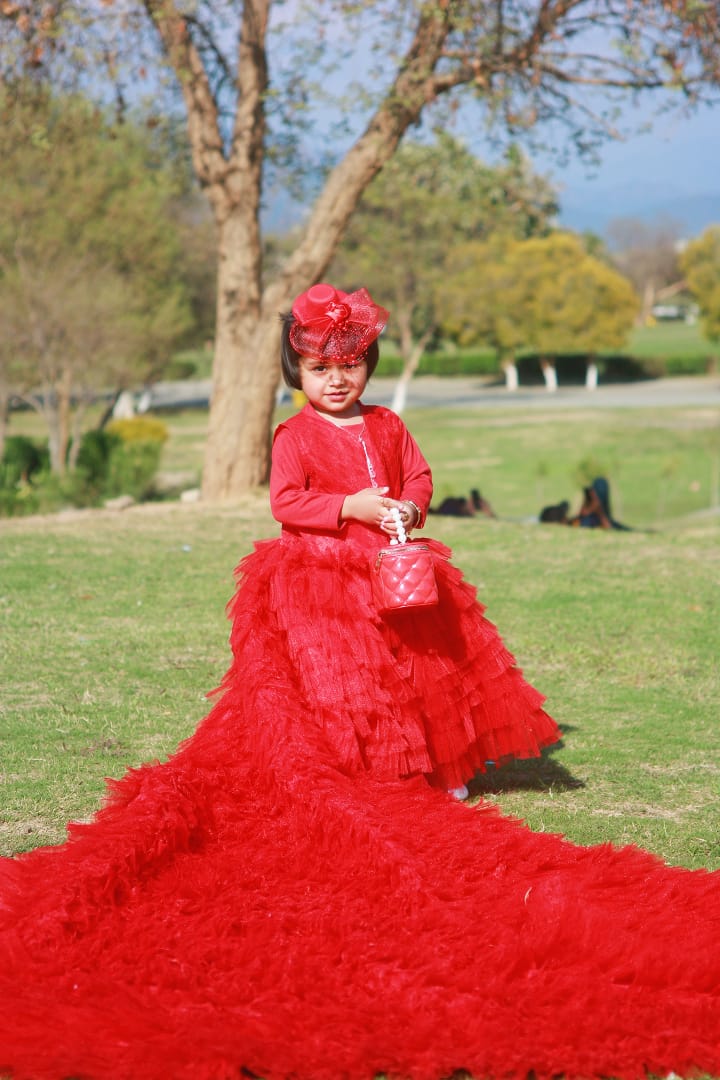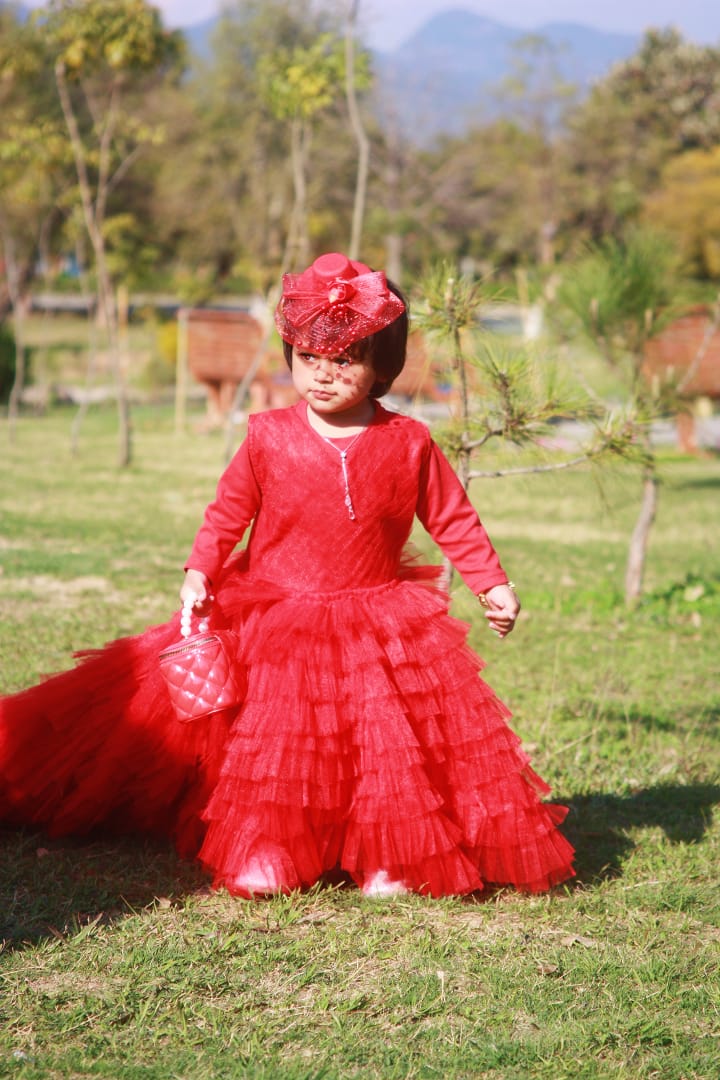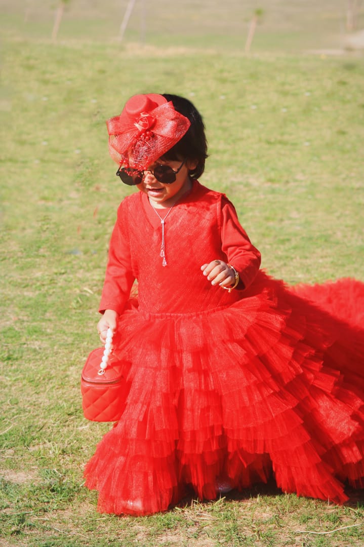 The frock is a vibrant red, long-sleeved gown with a layered, fluffy tulle skirt that extends into an elegant floor-length train. The bodice appears to have delicate lace or embroidered detailing, giving it a sophisticated, festive look suitable for special occasions like weddings or celebrations. The dress has a youthful, princess-like style that accentuates the wearer’s charm and elegance. 🌟