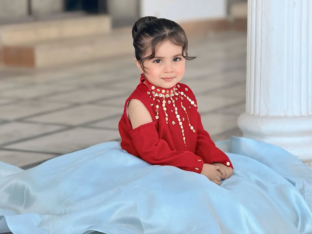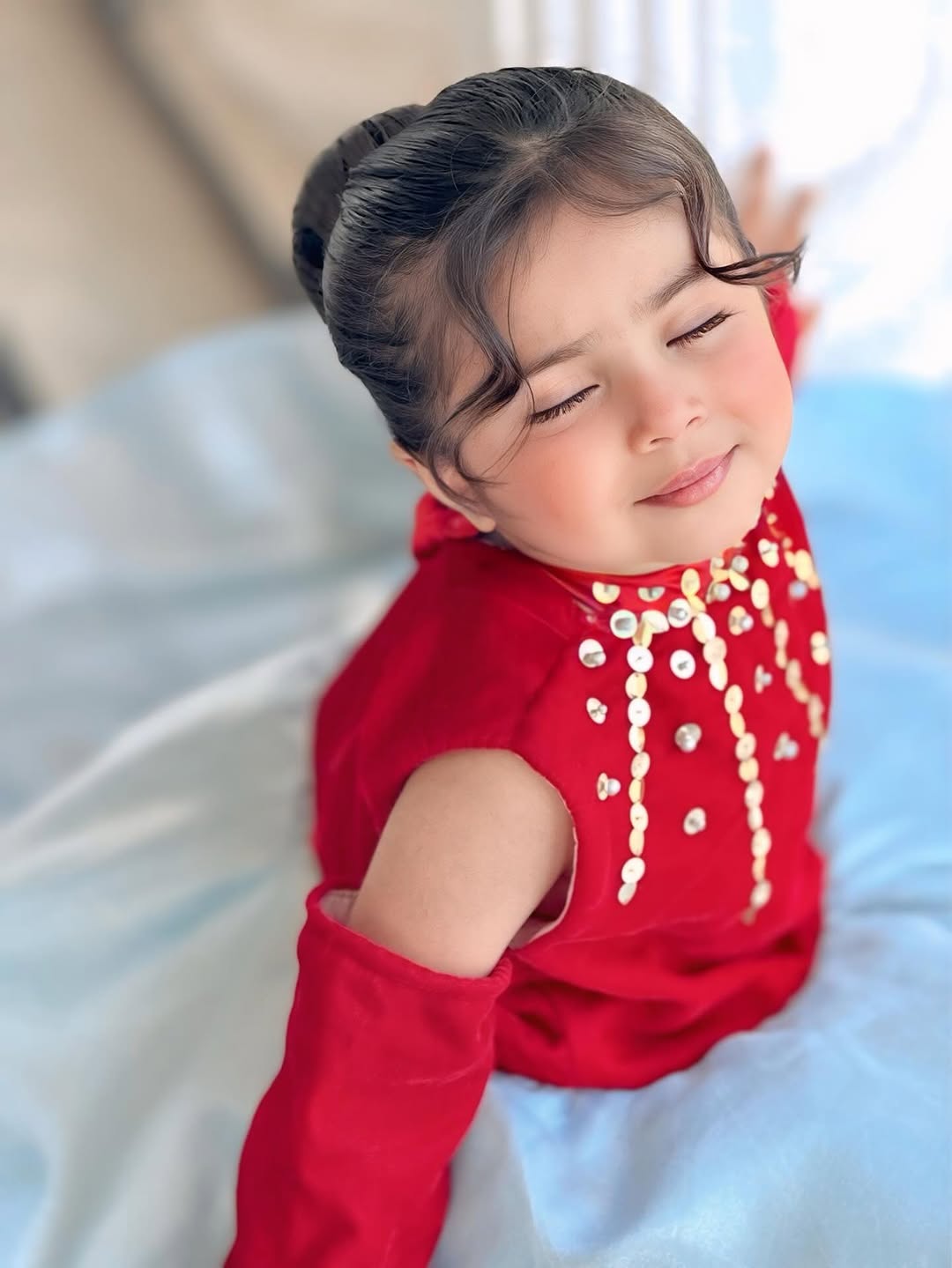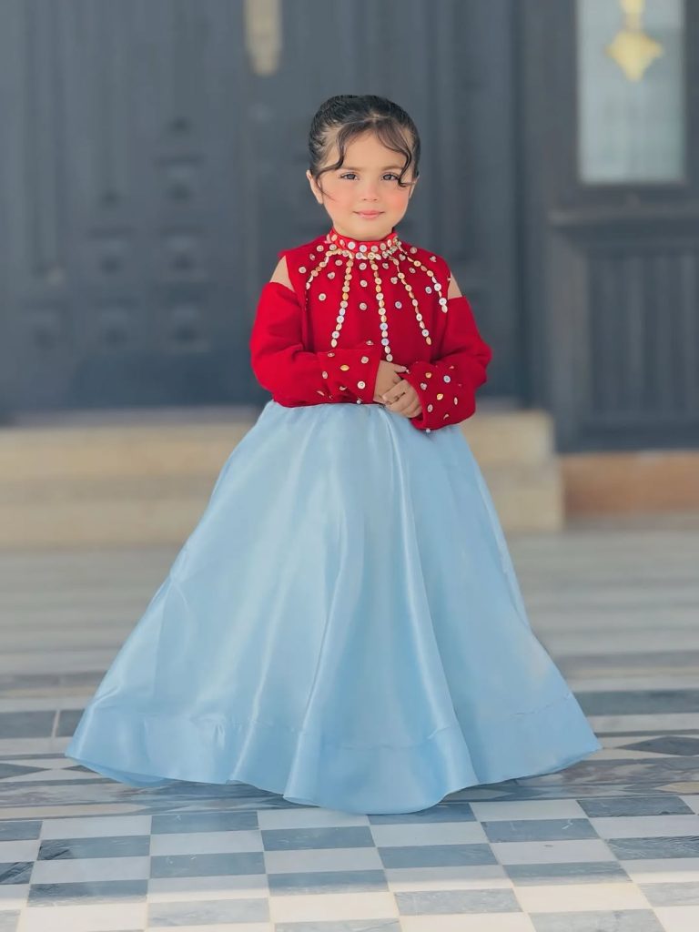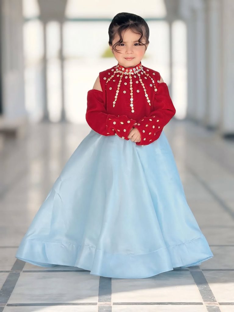 The *Ruby Glide* is a stunning children’s ensemble featuring a vibrant red, cold‑shoulder top adorned with elegant silver and gold sequins that catch the light beautifully. Paired with a flowing, light‑blue satin skirt, the outfit creates a graceful, princess‑like look perfect for special occasions, celebrations, or photo shoots. The contrast of the bold top with the soft, billowy skirt adds a touch of regal charm and timeless elegance to any young fashionista’s wardrobe.