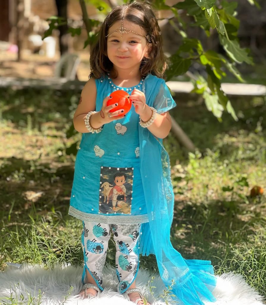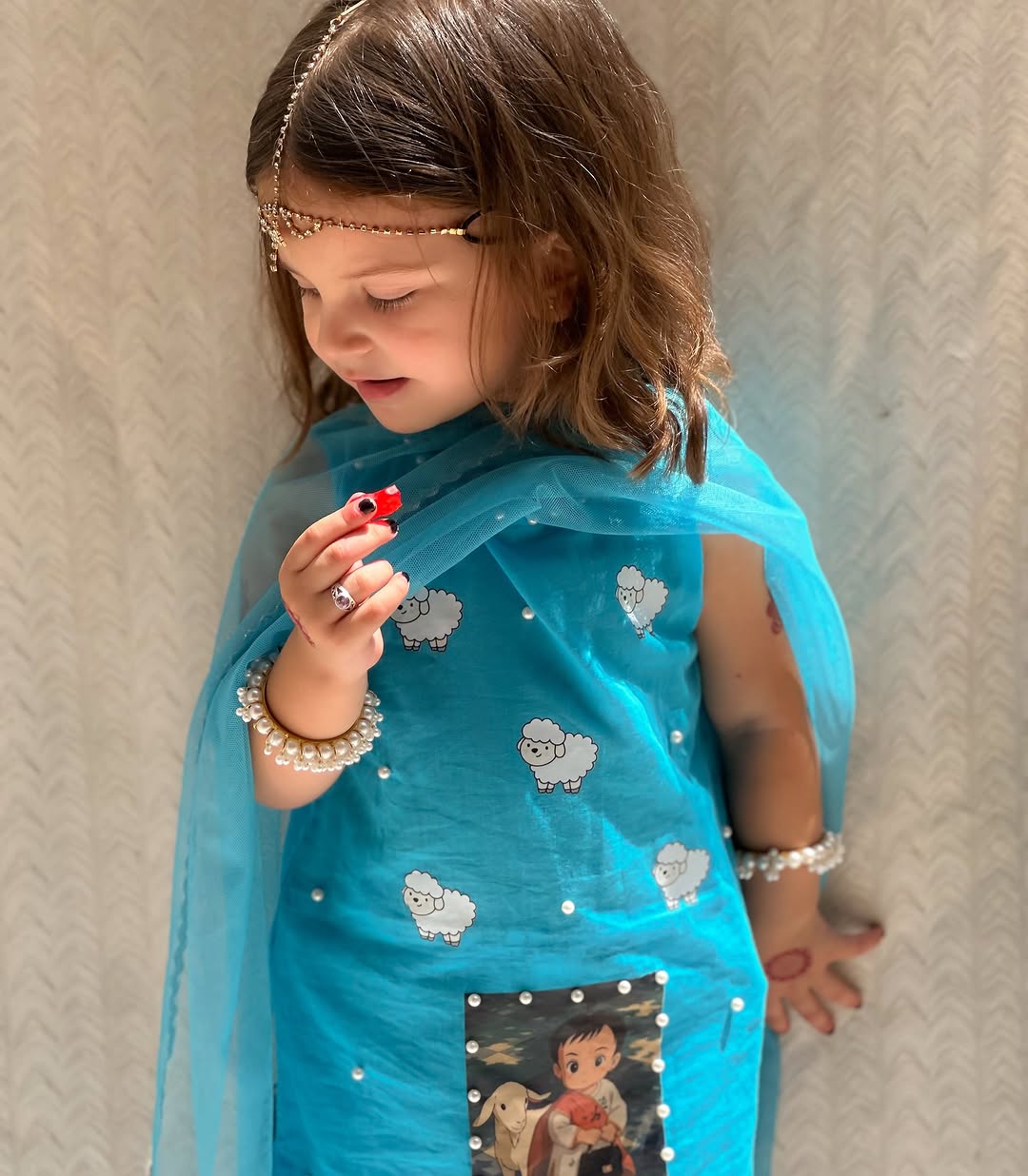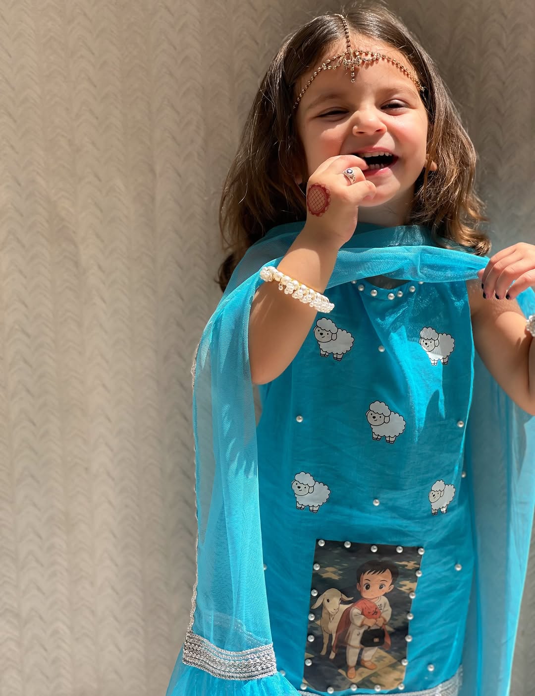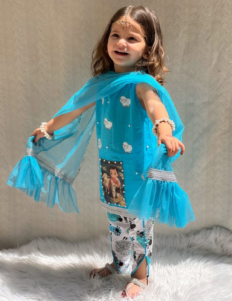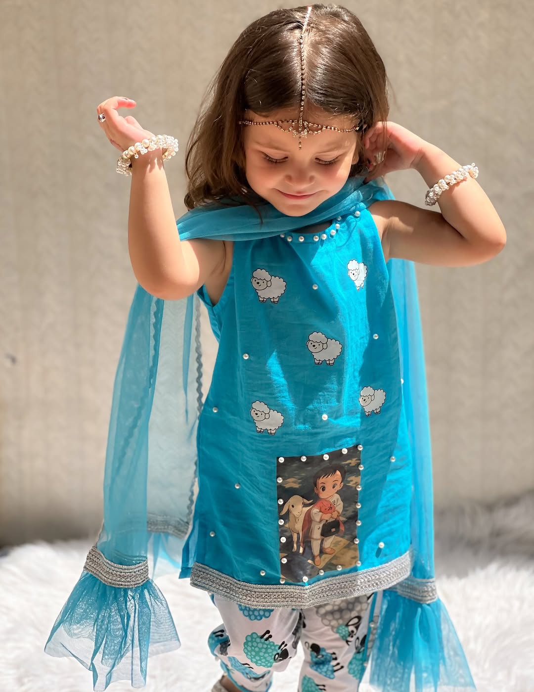 The dress is a vibrant blue, three-piece ethnic outfit designed for young girls. It features a bright teal-blue kurta adorned with cute white sheep fabric painting patterns and pearl-like embellishments around the hem and scattered on the fabric. The kurta has a printed patch at the front depicting a child with a sheep, adding a playful touch. It is paired with white leggings printed with blue and gray sheep motifs and silver lace detailing at the bottom. The ensemble is completed with a matching sheer blue dupatta edged with silver lace and pearl trim. It giving the look a festive, stylish appearance suitable for special occasions like Eid or cultural celebrations.