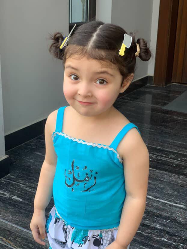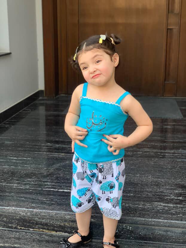 – A bright blue sleeveless top with thin shoulder straps and white lace trim around the neckline. The front of the shirt has name customized by fabric painting.