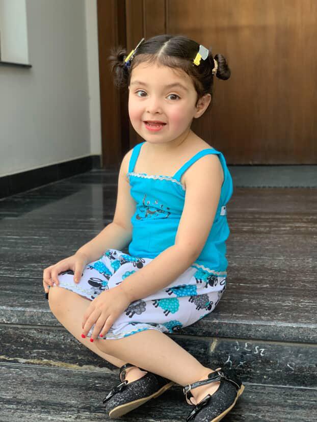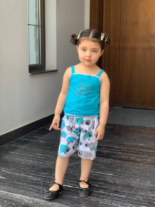 – White capri pants (shorts) printed with cartoon blue and gray sheep patterns.