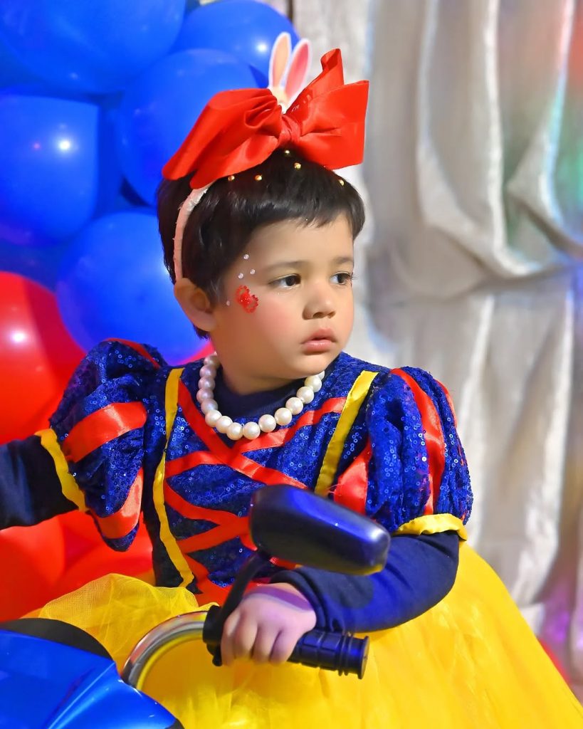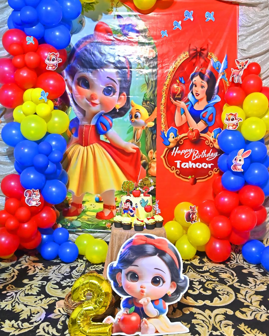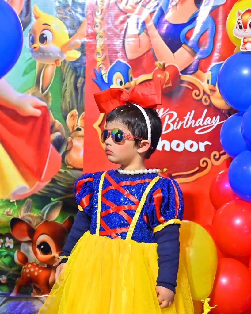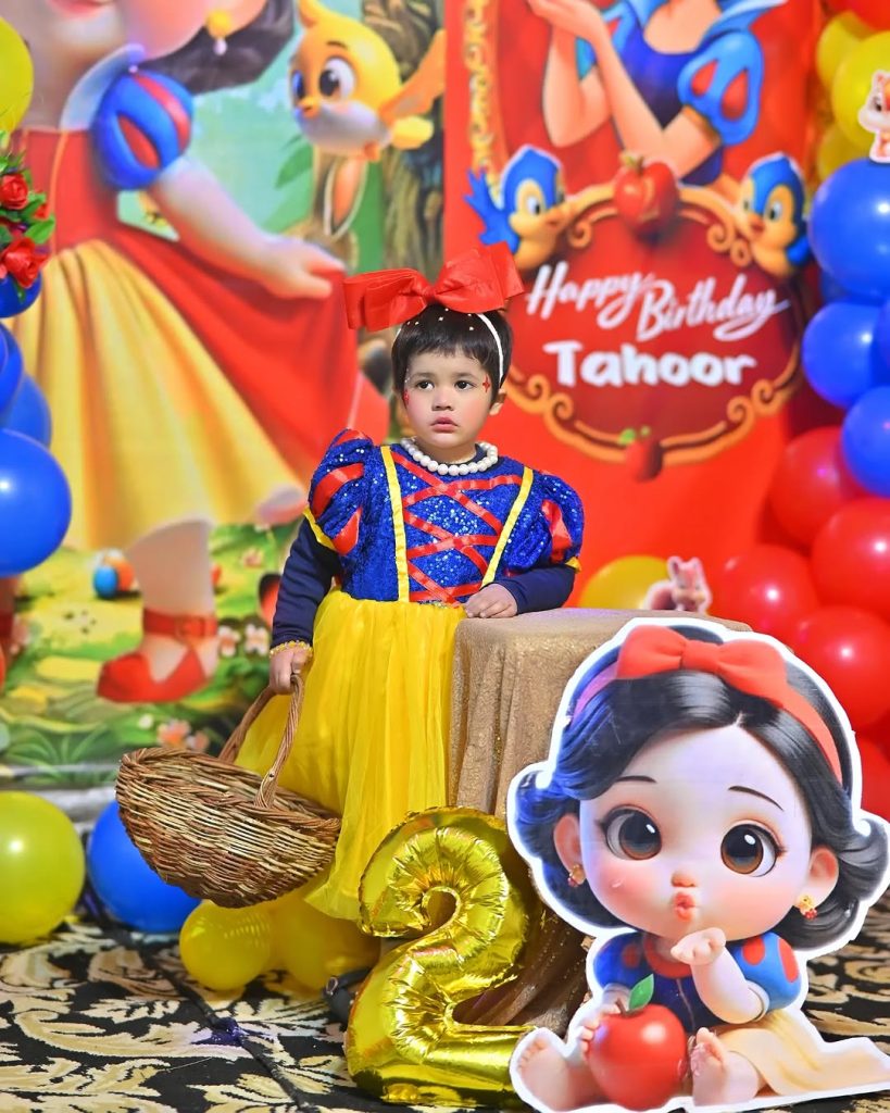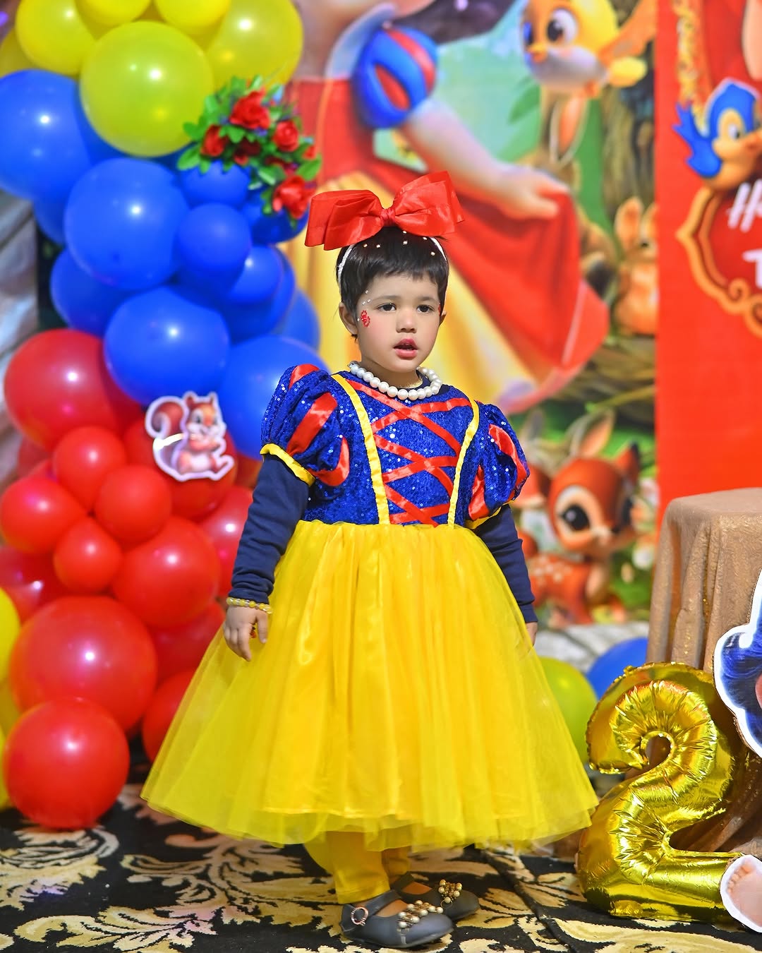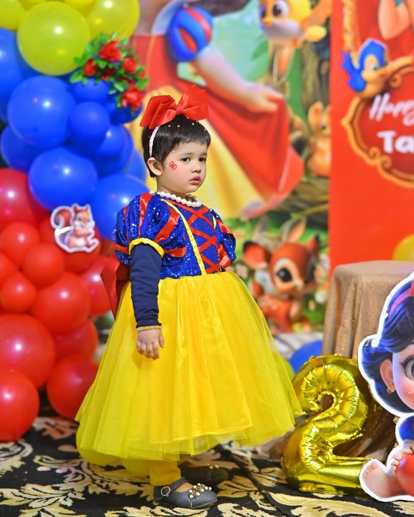The dress is a vibrant, themed costume inspired by Snow White. It features a blue sequined bodice with red criss‑cross straps and yellow trim, paired with a bright yellow tulle skirt that gives it a full, fairy‑tale look. The outfit is accessorized with a red bow headband, creating a festive party appearance suitable for a child’s birthday celebration.