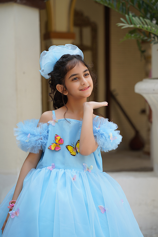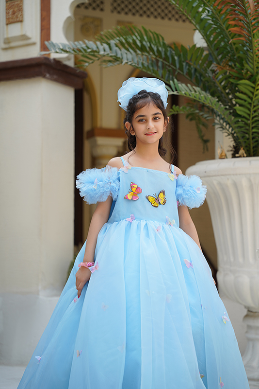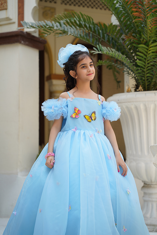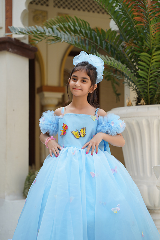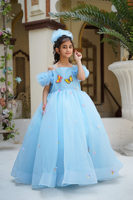 Made with organza and Indian silk fabric, featuring can-can straps over borders and butterflies embroidered all over the frock