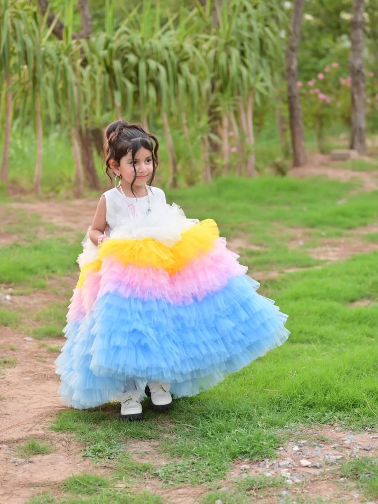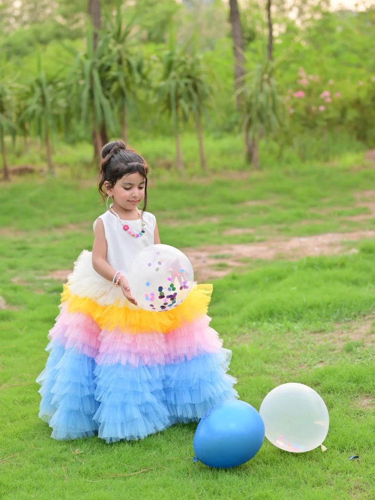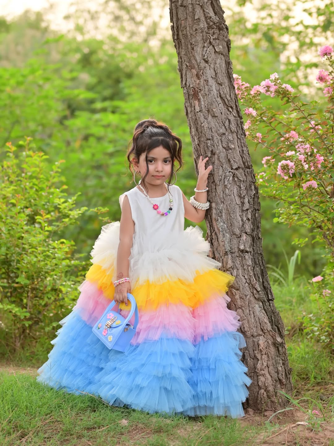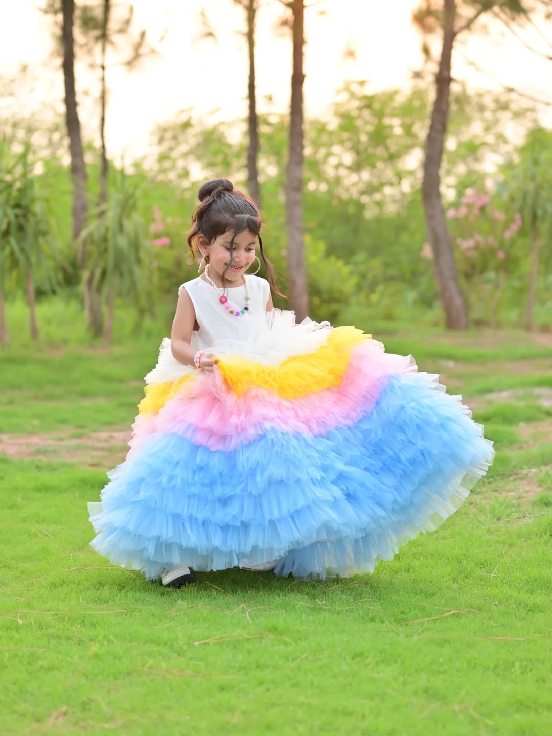 The dress is a stunning, layered gown with a sleek white sleeveless bodice that flows into a full, multi‑tiered tulle skirt. The skirt features vibrant, graduated ruffle layers of pastel colors—yellow at the top, followed by pink, and finishing with soft blue at the bottom—creating a cheerful, rainbow‑like effect. The overall style is playful and elegant, perfect for festive occasions like birthday parties or special celebrations.