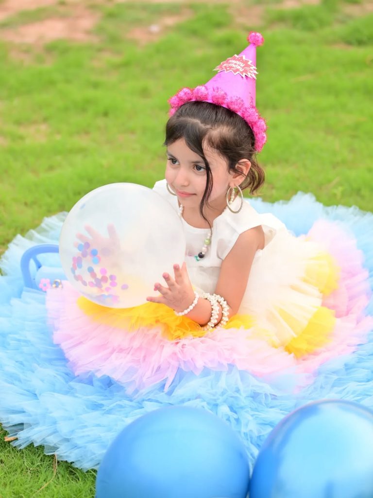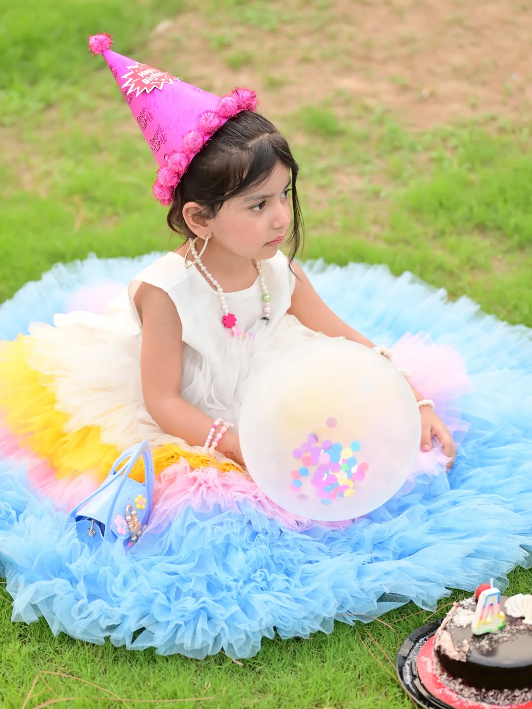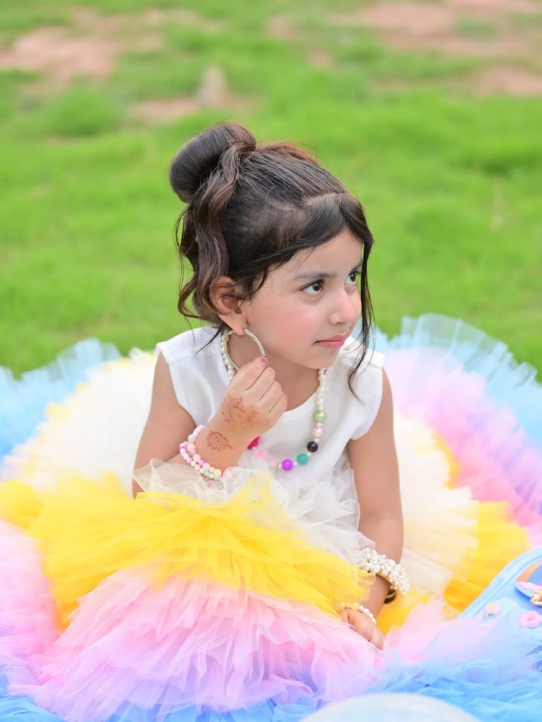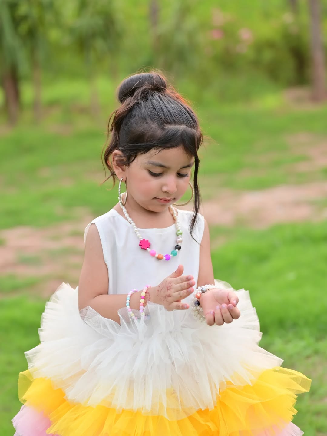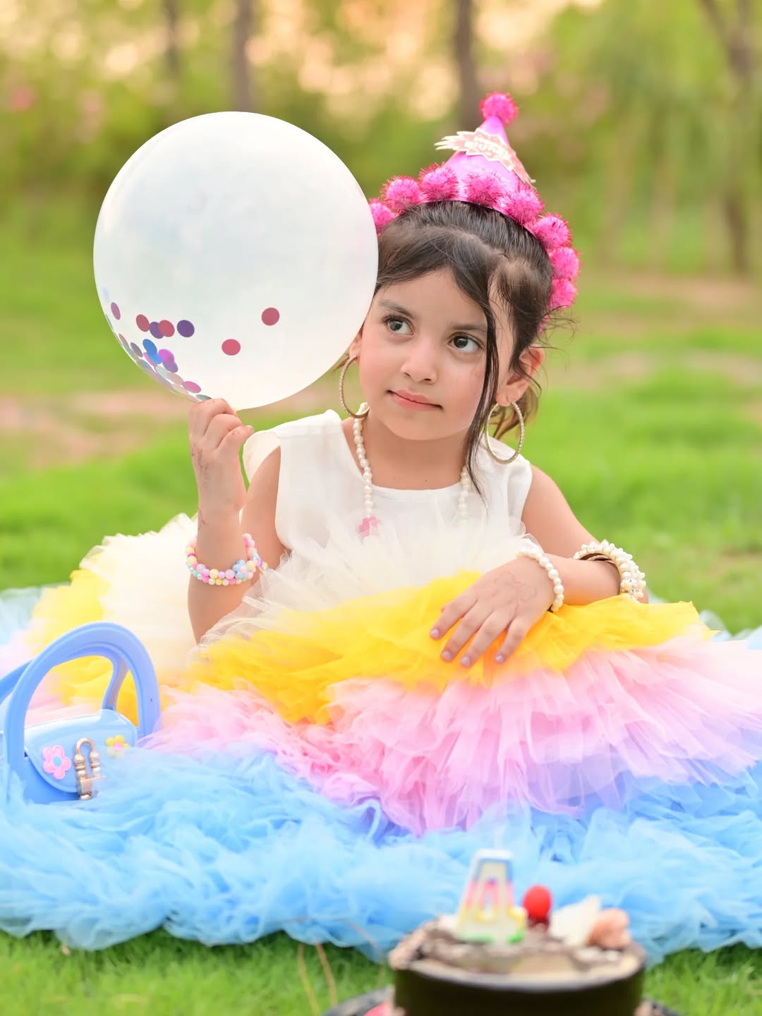 The dress is a stunning, layered gown with a sleek white sleeveless bodice that flows into a full, multi‑tiered tulle skirt. The skirt features vibrant, graduated ruffle layers of pastel colors—yellow at the top, followed by pink, and finishing with soft blue at the bottom—creating a cheerful, rainbow‑like effect. The overall style is playful and elegant, perfect for festive occasions like birthday parties or special celebrations.