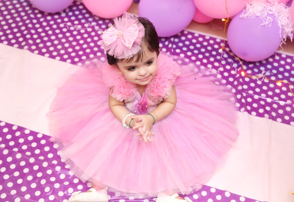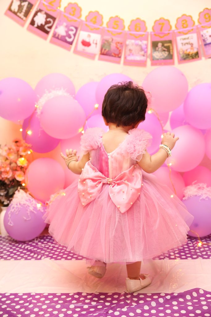 “pretty pink princess dress with a tulle skirt, pearl‑decorated bow, and ruffled sleeves, perfect for birthday parties or special occasions.