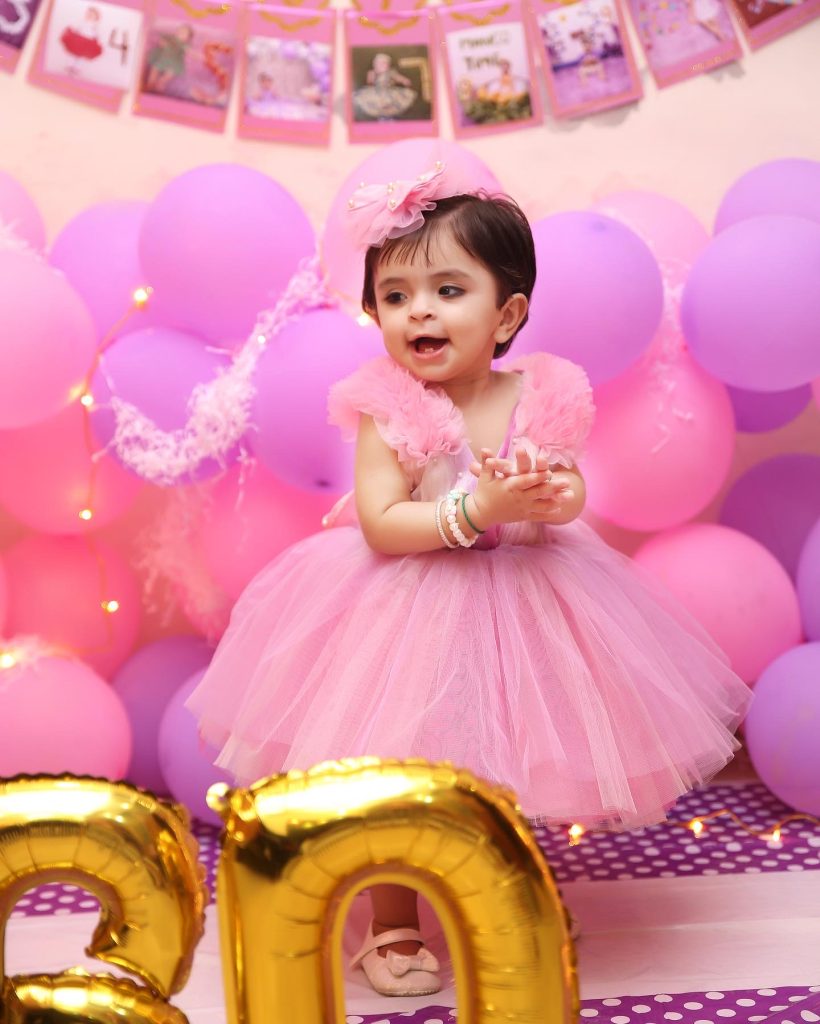 – A pink tulle skirt with layered fabric giving a fluffy, elegant look.